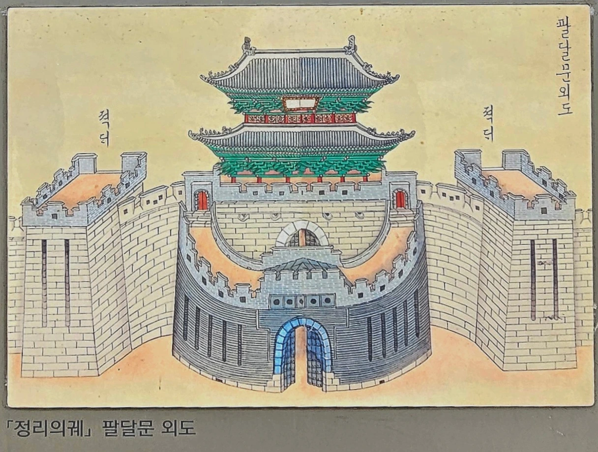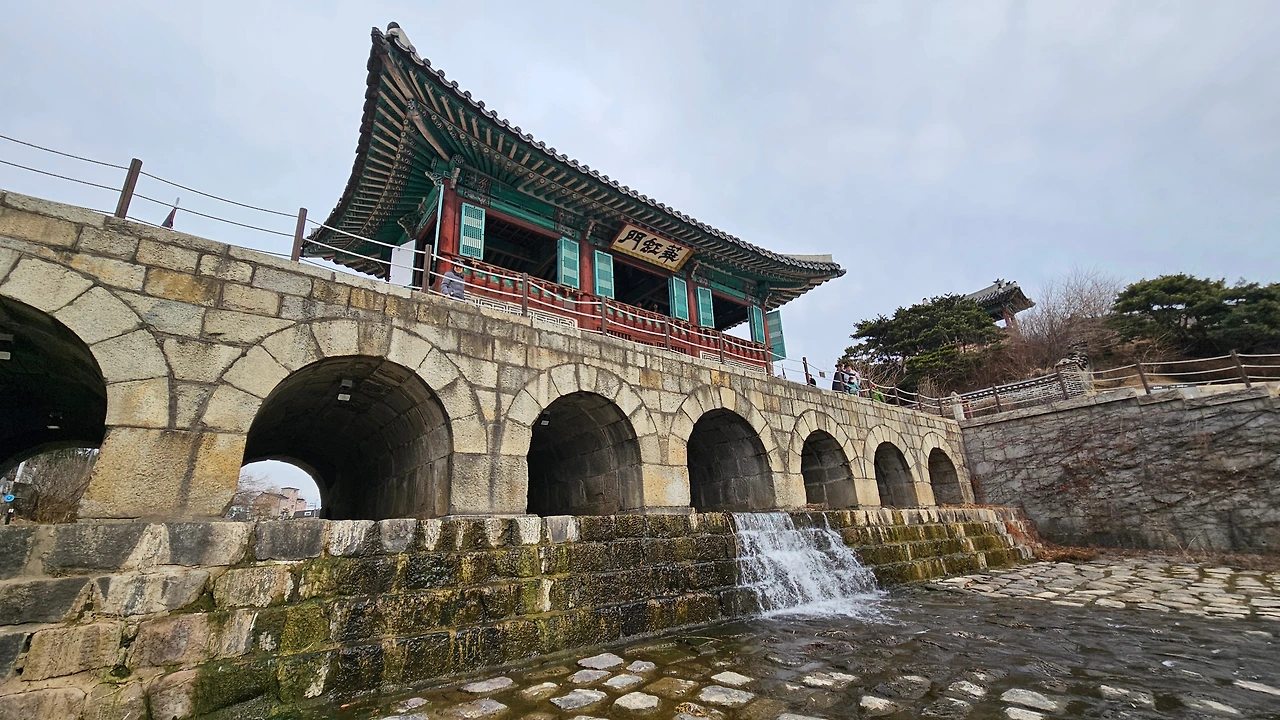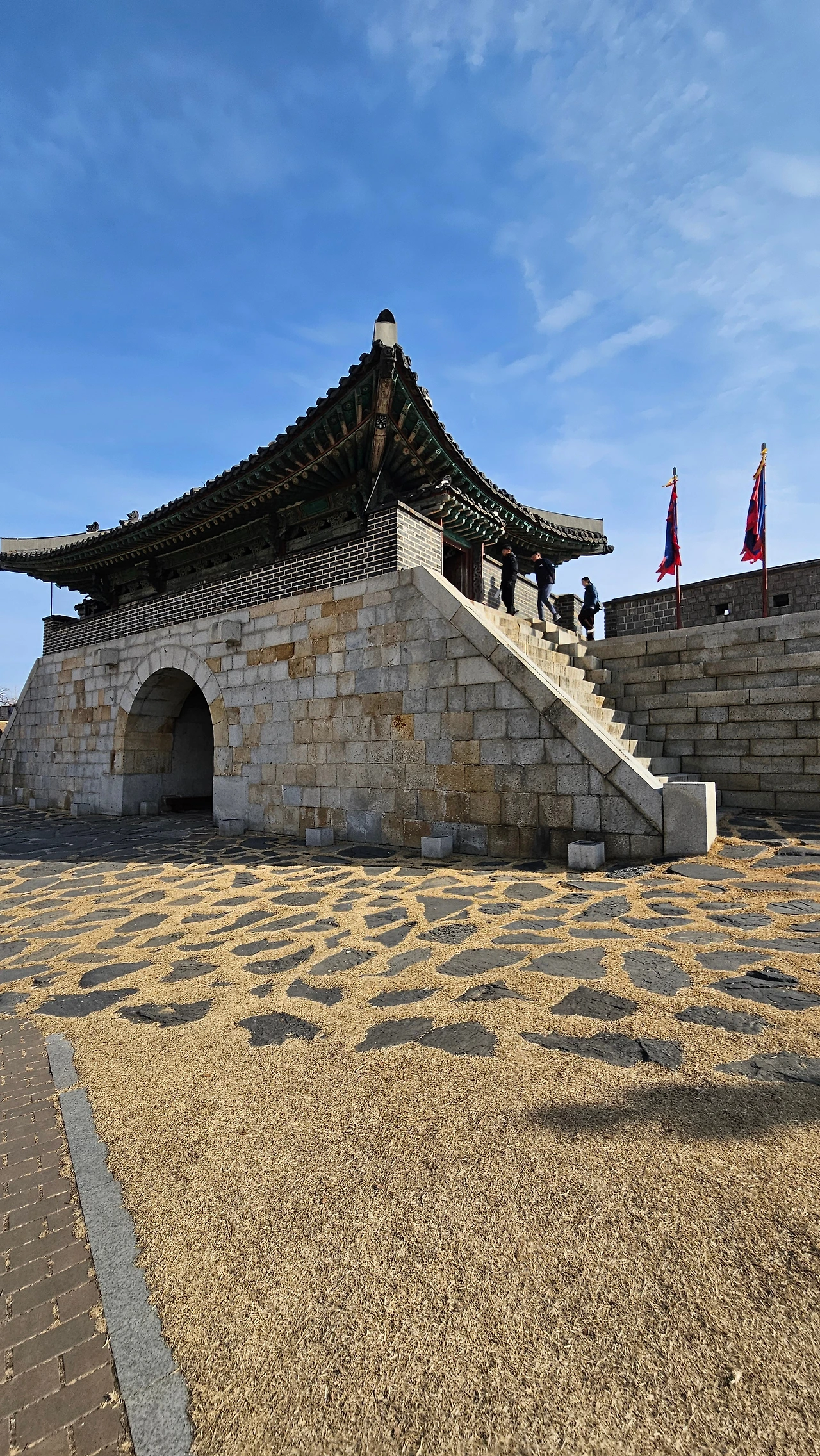 성문 안쪽에 군사들의 훈련장으로 쓰였다는 누런 빛 잔디밭 공터가 넓게 펼쳐져 있다. 한국 전쟁 때 파괴되었다가 1976년에 복원되었다는 문루 위로 올라섰다. 좌우 성곽에는 붉은색 깃대에 푸른색 깃발이 일정한 간격을 두고 서서 바람에 나부끼고 있다. 성곽에 안긴 성안 마을과 멀리 팔달산 위의 서장대 등이 한눈에 들어온다.