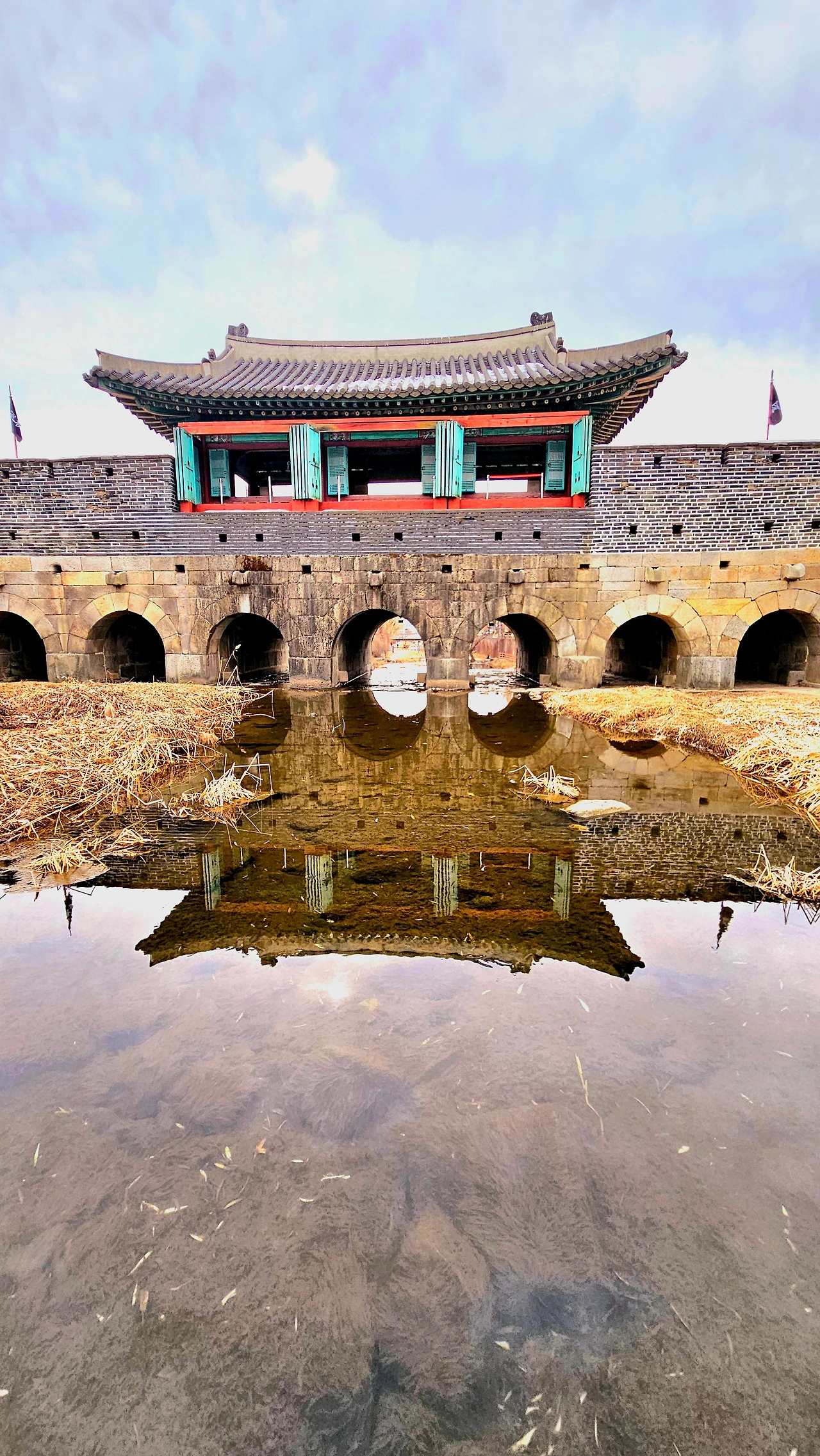 용연을 휘돌아, 화성 가운데를 남북으로 가로질러 흐르는 수원천에 놓인 징검다리를 건넜다. 수원천 위에 놓인 남수문과 북수문 중 북수문인 화홍문은 7개의 무지개 모양 수문이 설치되어 있다. 징검다리 아래쪽 물 위에 어린 화홍문(華虹門)의 자태가 아름답다.
