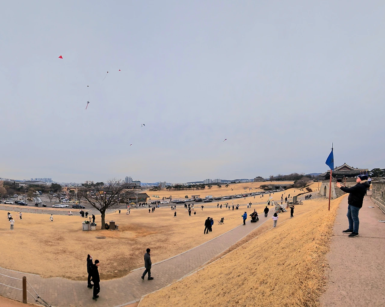 성곽을 온전히 한 바퀴 돌아 창룡문으로 돌아왔다. 오전에 비해 더 많은 사람들이 창룡문 성안 너른 잔디밭을 유유자적 거닐며, 봄날처럼 포근한 겨울의 오후를 만끽하고 있다. 높은 빌딩이라곤 보이지 않는 성안 탁 트인 하늘에는 길게 푼 연줄 끝에서 갖가지 모양의 연이 자유롭게 유영하고 있다. 저 연들처럼 내게도 나의 영혼이 자유로이 노닐 수 있는 하늘 한쪽이 허락되면 좋겠다. 0126