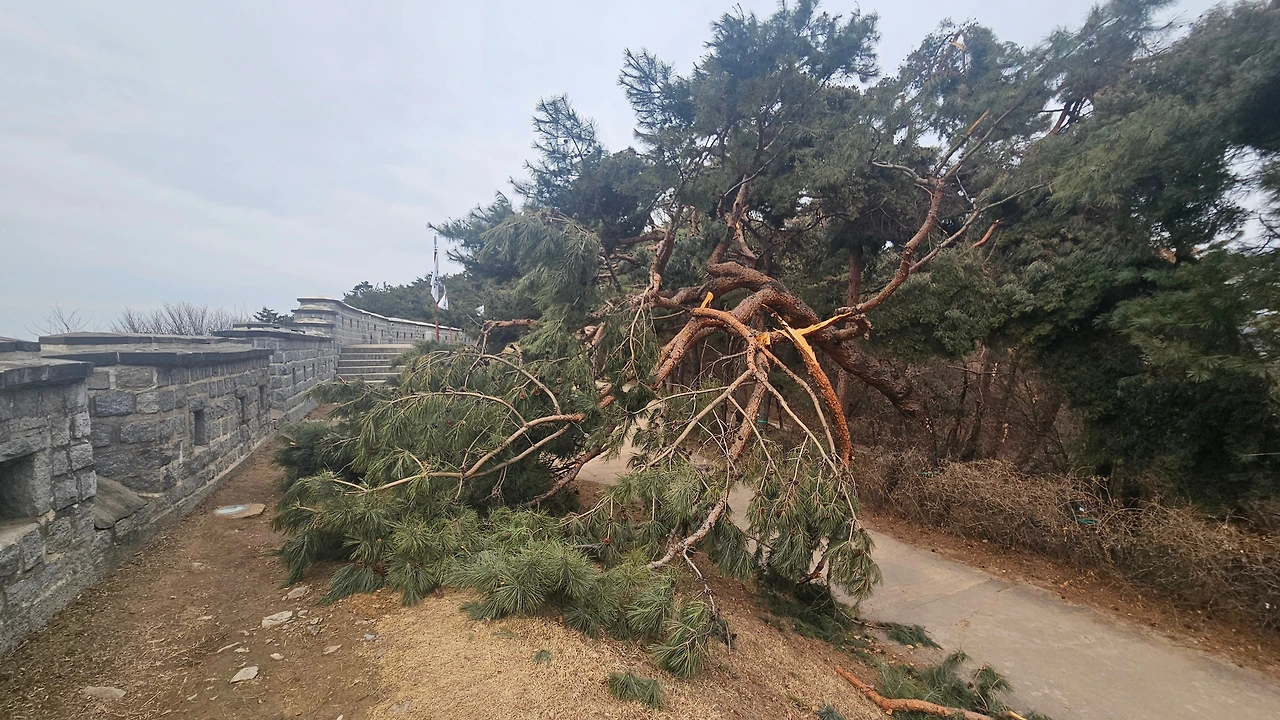 화서문을 지나자 깃발이 흰색으로 바뀌었다. 성곽은 용솟음치듯 서북각루, 서 1치, 서포루 등을 지나며, 팔달산 위의 서장대로 오른다. 성곽 안쪽 산비탈에 둥치가 꺾여 누런 속살을 드러내고 있는 노송들이 간간이 눈에 띈다. 금년에는 산행을 하면서 유독 여러 산에서 습설과 강풍에 줄기가 두 동강이 나거나 가지가 꺾인 고목들을 숱하게 보았었데, 이곳의 저 노송들도 자연재해의 횡포를 피해 갈 수가 없었나 보다.