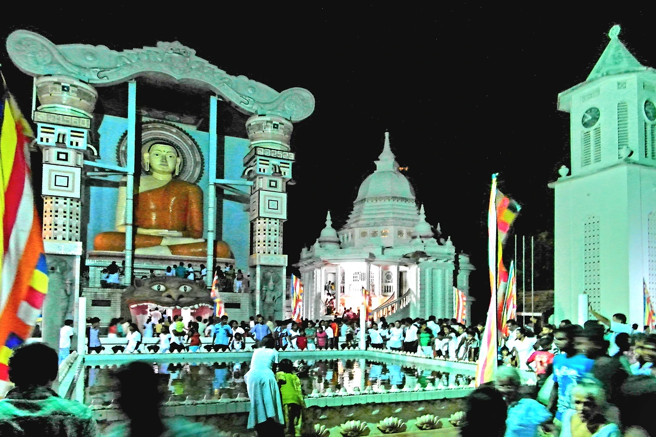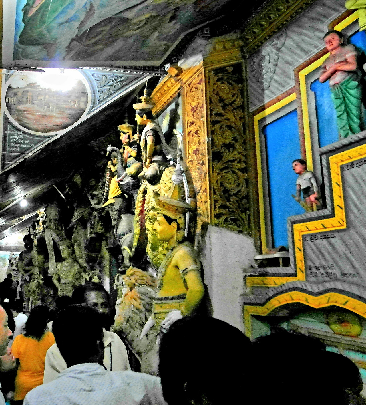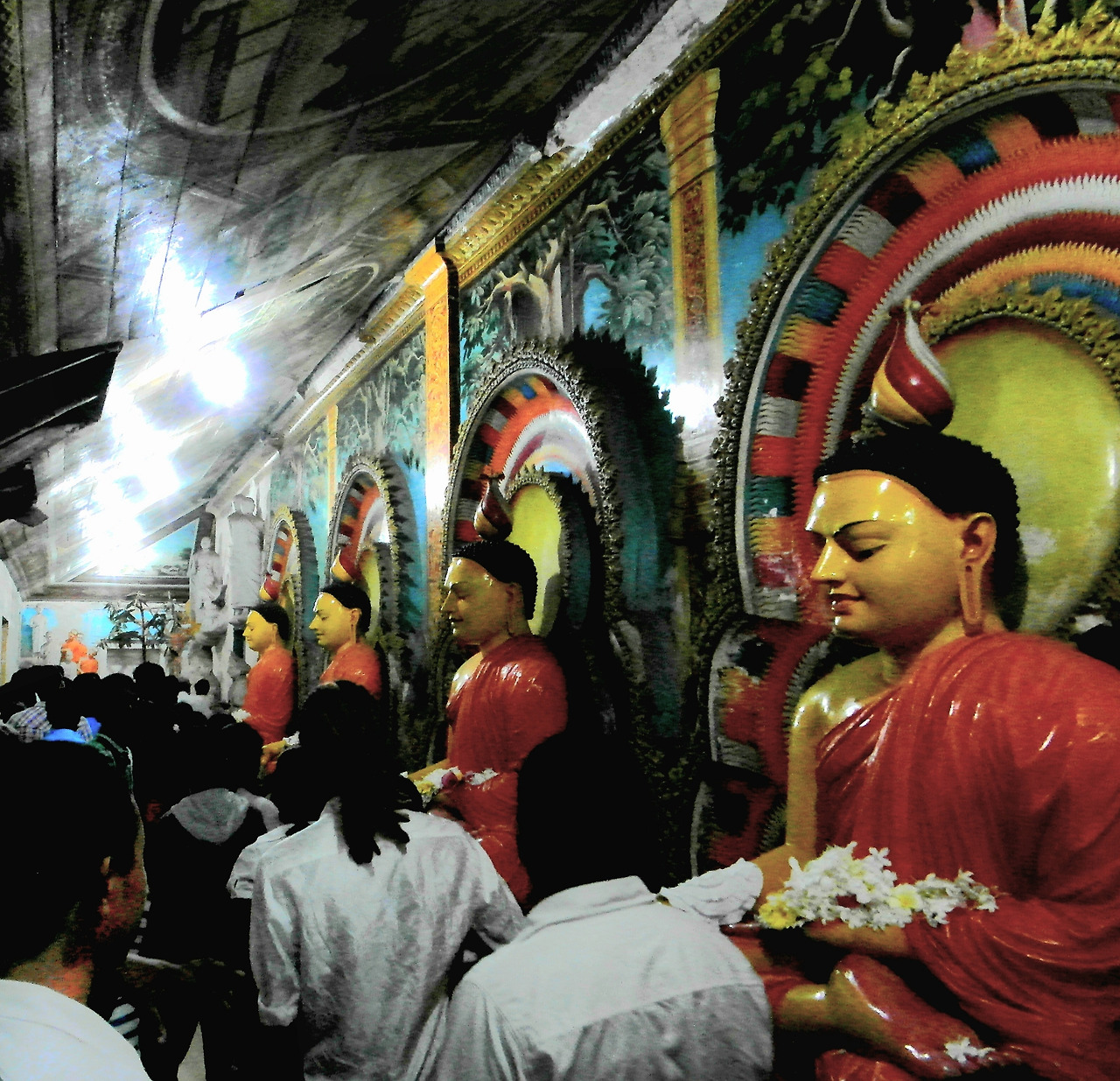 네곰보 석호 북쪽 시 중심부에 앙구루카라물라 사원이 자리한다. 오월 보름 축제기간 중이라 그런지, 이른 저녁 시간에 도착한 사원은 많은 사람들로 붐비고 있었다. 두 눈을 부릅뜨고 크게 입을 벌린 용의 모습을 한 아치형 게이트 뒤에 6미터 높이 부처상이 가부좌를 틀고 앉아 전면에 연못처럼 생긴 수조를 내려다보고 있다. 사원 벽면을 장식한 출가와 고행 등 부처의 일생을 형상화한 원색의 부조상들은 당장이라도 살아 움직일 듯 생동감이 있다.