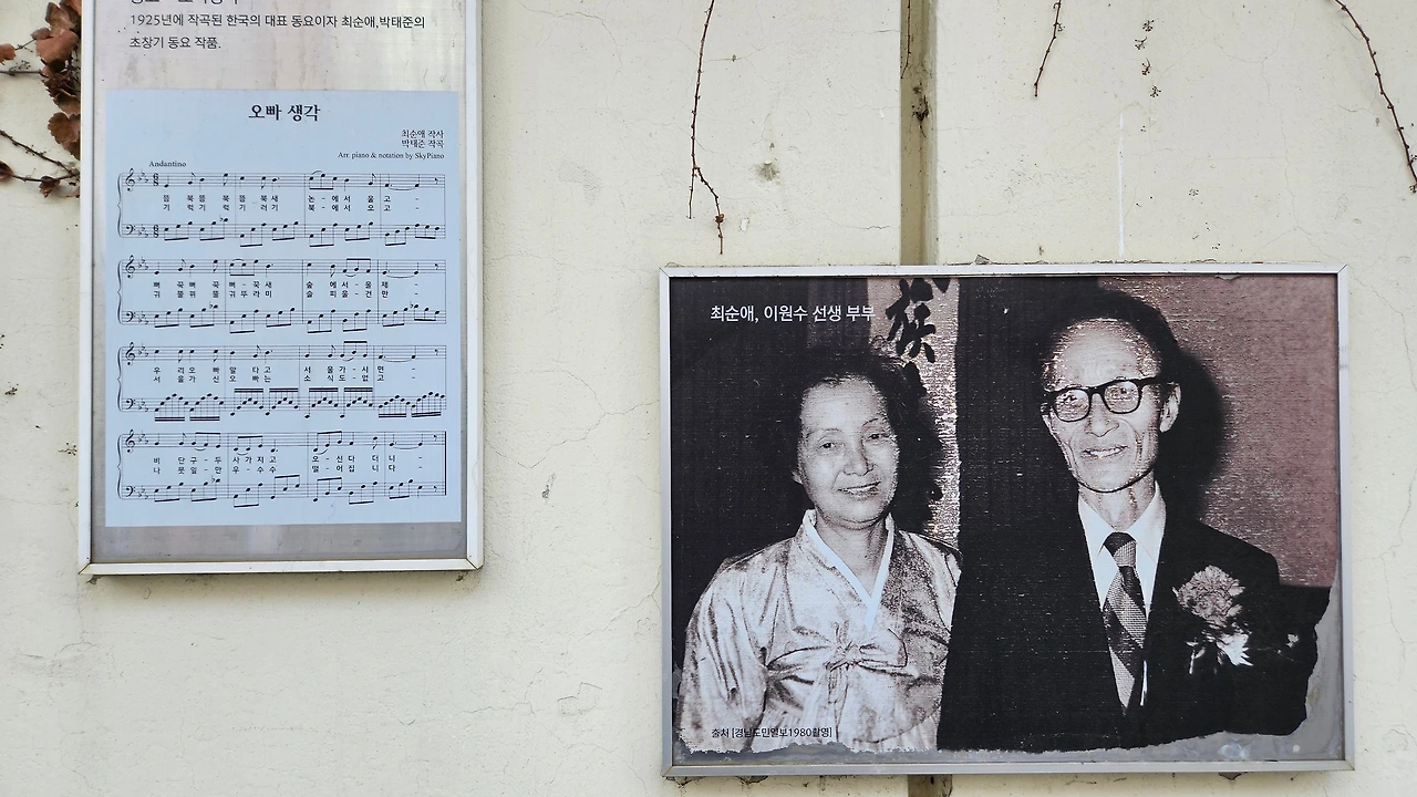 그중에는 '최순애(1914-1998), 이원수(1911-1981) 선생 부부'라는 제하에 두 분의 사진도 눈에 띈다. 그 옆에는 1925년에 탄생한 최순애 작사, 박태준 작곡의 동요 <오빠 생각>의 악보와 가사가 함께 붙어 있다. 이 부부도 예술인마을에 정착했었나 보다.