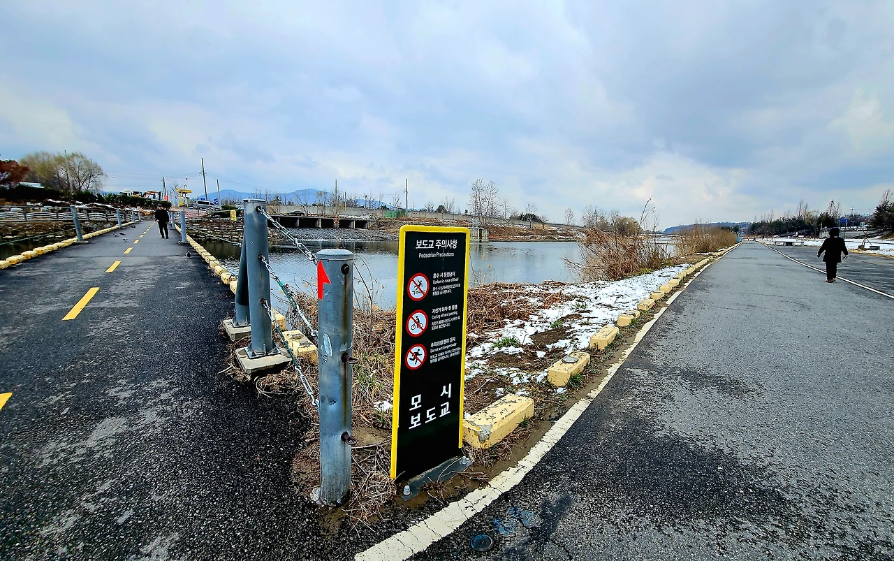 '동방삭 인도교'의 아래위 쪽 다리 옆에도 각각 '인절미 보도교'와 '모시 보도교'라는 다리 이름과 주의사항이 적힌 안내판이 서있다. 기왕이면 다리 이름 유래에 대한 설명을 곁들였다면 좋았을걸, 하는 아쉬운 생각이 들었다. 조심조심 걸음걸이에도 왼쪽 무릎 관절은 여전히 불편하지만, 다리 이름의 내력에 대한 궁금증에 다리의 통증이 잠잠해지는 듯하다.