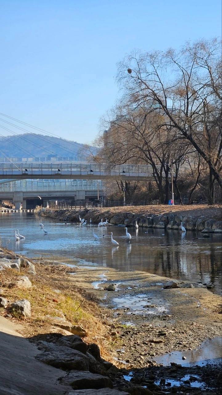 삼삼오오 모여 자맥질을 하는 오리, 보(洑)나 여울 근처에서 긴 다리를 물속에 닮근 채 물속을 응시하고 있는 해오라기, 천변 풀밭 위를 깡충깡충 뛰어다니는 까치 부부, 산책로 위를 이리저리 선회하며 군무를 펼치는 비둘기 떼,... 곳곳에 남아있는 잔설이 계절의 흐름을 알릴 뿐, 가슴 깊이 변함이 없는 수위처럼 탄천 주변 풍경은 여느 때와 다름없다.
