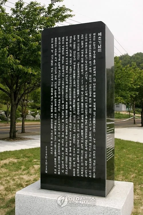 그래서일까, 저자가 "우리 역사 속에서 밖으로 나가는 통로였다"라고 했던 평택의 평택호 부근에 2009년 5월 28일 '혜초 기념비'가 세워졌다.