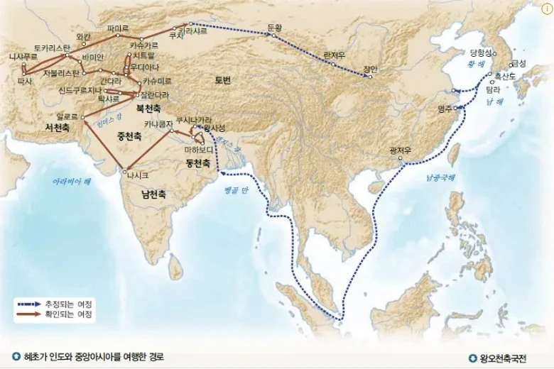 혜초는 719년 당나라 광주(廣州)에 도착하여, 남천축 출신의 밀교승 금강지(金剛智; Vajrabodhi, 669-741)를 만나 그를 사사(師事)했다. 금강지의 권유로 723년에 광주를 떠나 스승이 건너온 바닷길을 거꾸로 잡아 폐사리국( 현재 인도 동북부 바이샬리)에 도착하여, 갠지스 강을 따라 바라나시∙카슈미르∙페르시아 지방 등 인도와 아랍 일대를 순유하고, 727년 11월 상순에 안서도호부(安西都護府) 소재지인 구자(龜慈; 현 신강 위구르 자치구의 Kucha)를 거쳐 장안으로 돌아왔다. 혜초가 이동한 경로는 육로로만 1만 km가 넘고 기간은 장장 4년에 걸친 멀고 긴 여정이었다. 혜초는 죽음을 무릅쓰고 고행을 자초하면서 다른 세계로 걸어 들어가서 직접 보고 듣고 체험한 이문명(異文明)에 대한 기록을 남긴 위대한 여행자요 순례자였다.