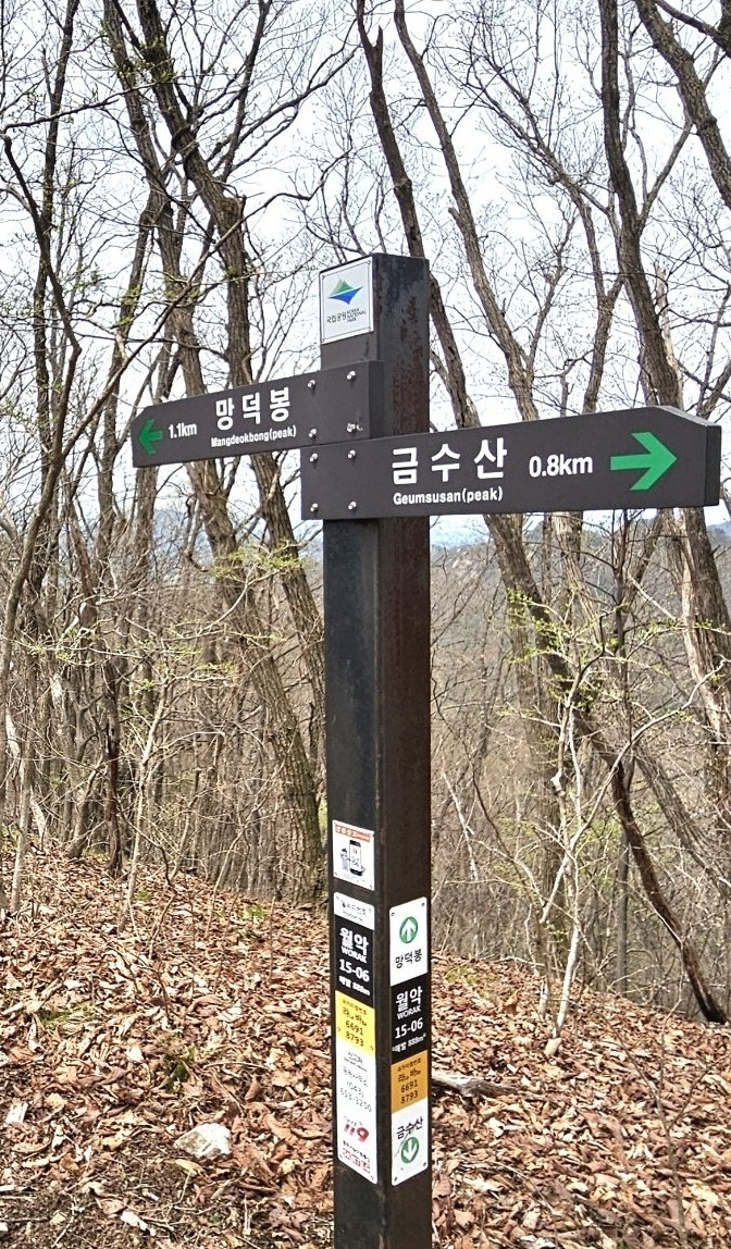정상을 뒤로하면 지그재그로 난 가파른 철계단이 1.9km 거리의 망덕봉으로 안내한다. 올라올 때와는 달리, 능선을 따라 난 시야가 툭 트인 등로는 산행의 묘미를 더해며 정상에서 300m쯤 거리에는 전망 데크도 내어 놓는다. 전망대 아래 망덕봉삼거리로 내려서면 단양군 적성면 상학동과 제천시 삼수면 갈림길에서 이정표가 망덕봉까지 1.6km라고 알려준다.