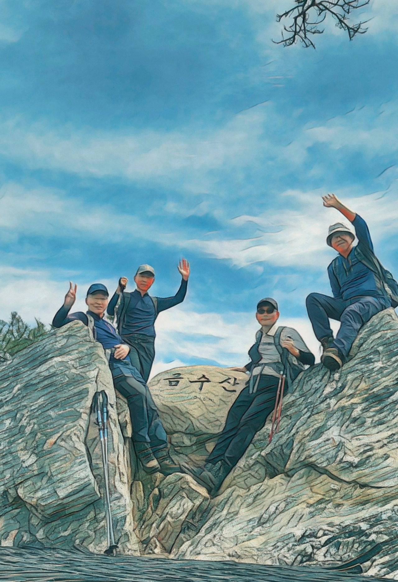 멀리서 보면 산능선이 미녀가 누워 있는 모습을 닮았다고 하여 '미녀봉'이라고 불린다는 금수산 정상에 올라섰다. 해발 200m쯤의 들머리로부터 해발 1016m 산정까지 800여 m를 올라온 셈이다.