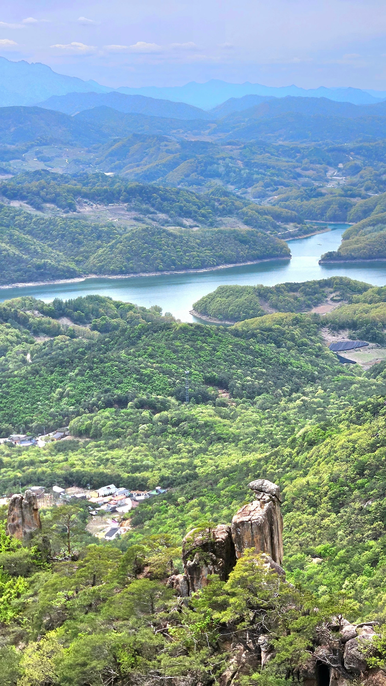 큼직한 두 개의 바윗돌 사이에 정상석을 배경으로 기념사진을 남기고, 청풍호 월악산 단양 방향 등 사방으로 툭 트인 전망을 한동안 조망했다. 단양의 적성면을 지나는 중앙고속도로는 숨바꼭질하 듯 숨었다 나타났다 하며 산줄기 속으로 모습을 감춘다.