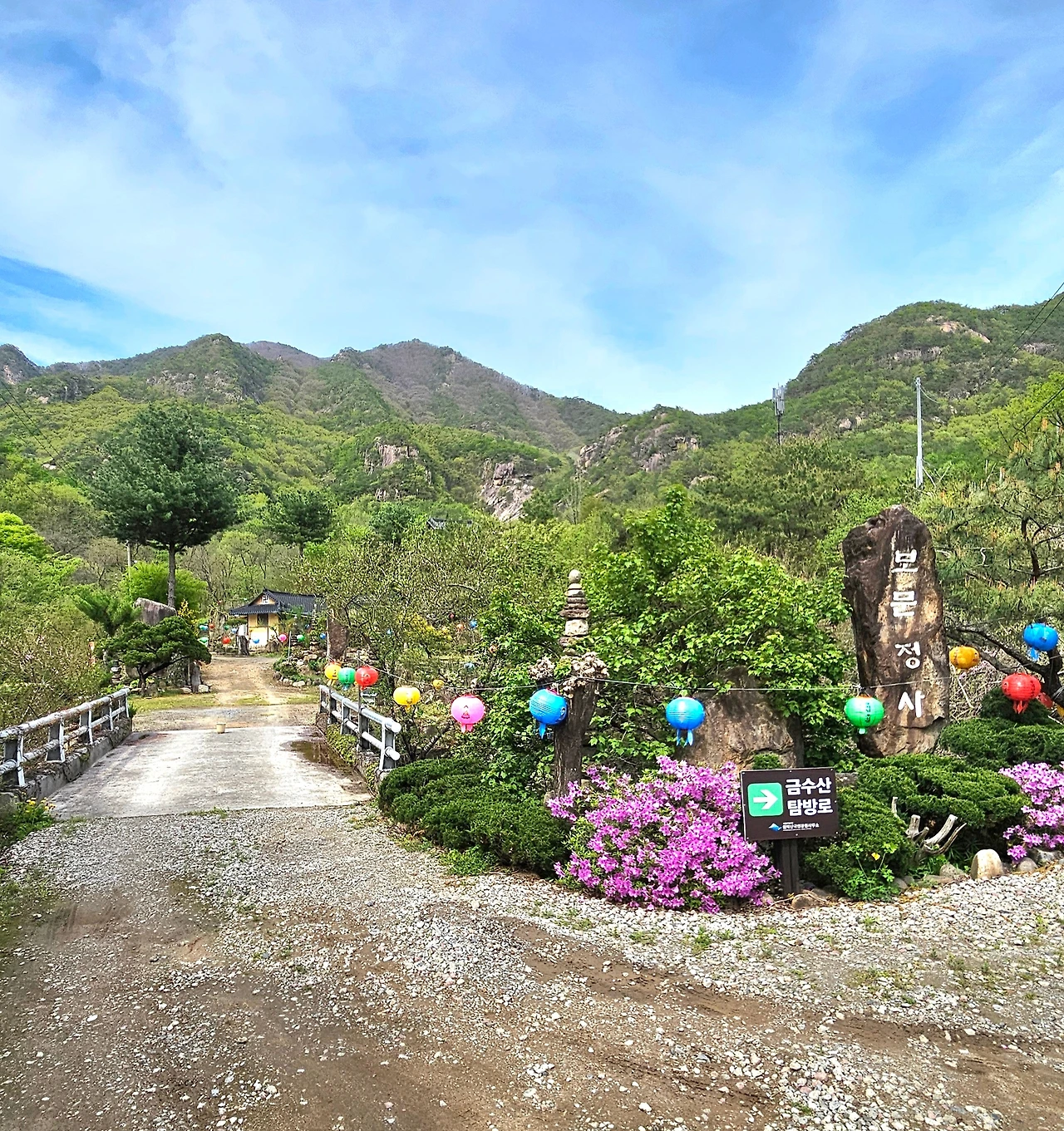 상천리 마을로 내려서서 보문정사의 뒤편 산신각 쪽으로 들어서서 정문 쪽으로 내려오며 경내를 둘러보았다. 번듯한 법당의 모습은 볼 수 없지만 경내 곳곳에 자연석 돌로 정성스레 쌓은 돌탑들이 여기는 절집입니다,라고 무언의 말을 건네고 있다. 상천주차장에 도착하며 원점 회귀 산행을 마무리하고 뒤돌아서서 다시 한번 금수산을 올려다보았다.