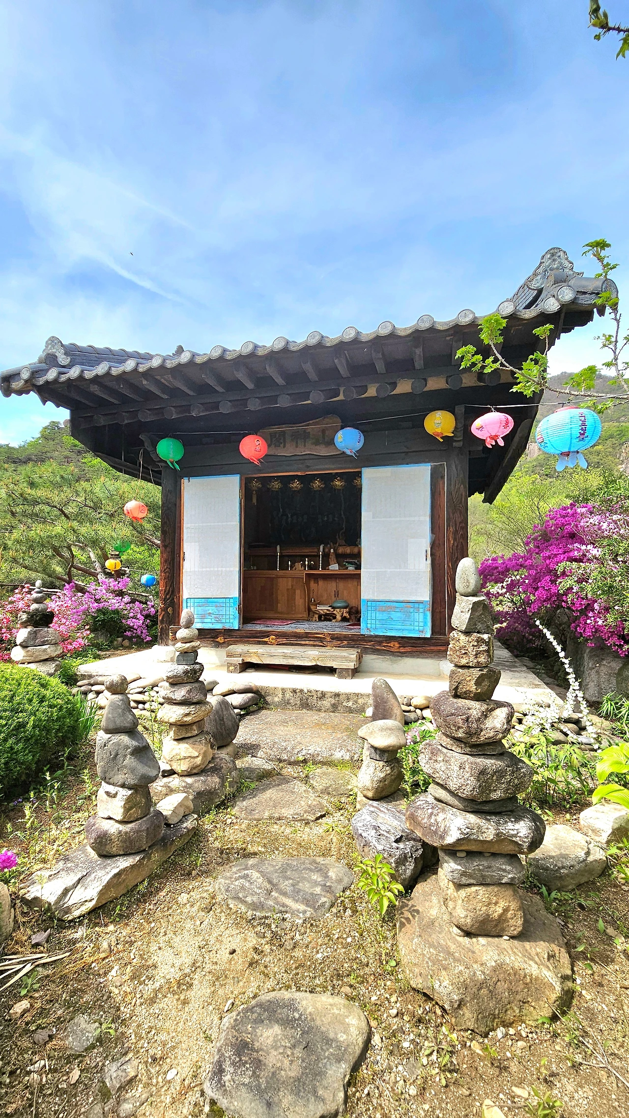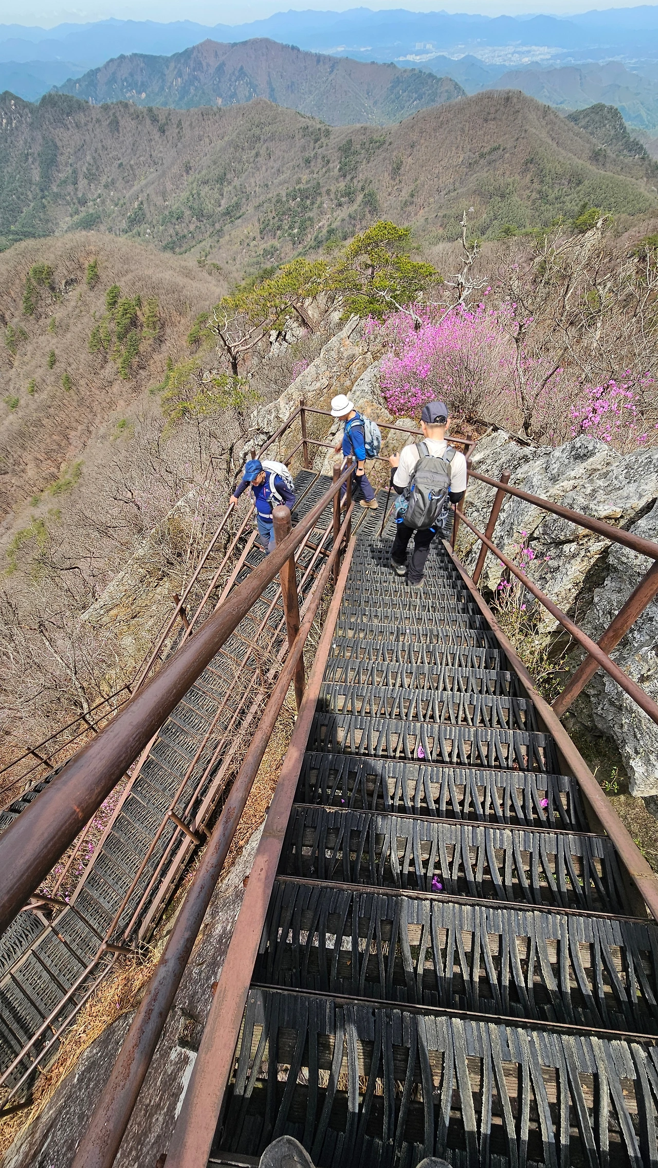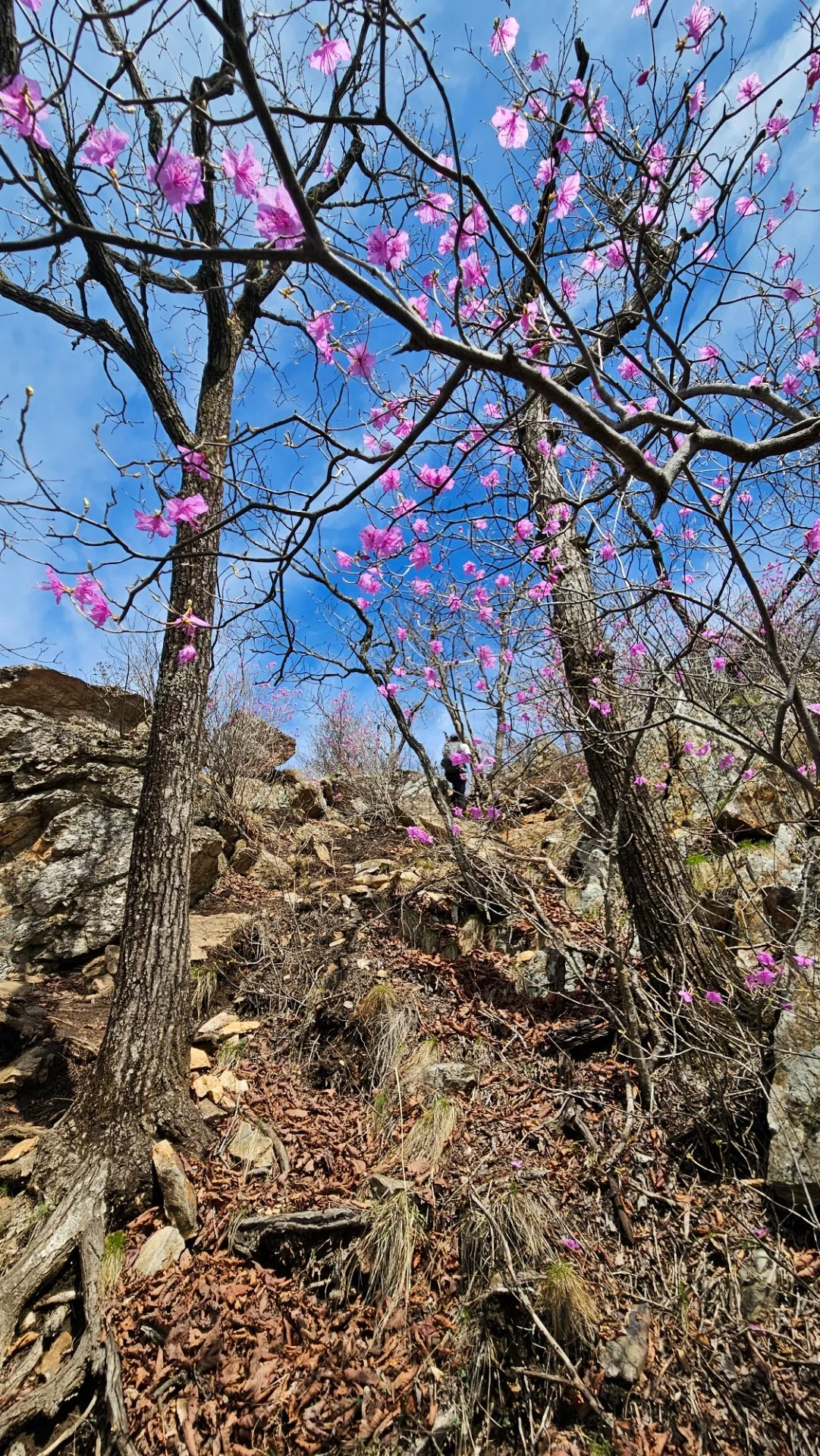 천국의 계단처럼 높게 뻗은 철계단을 따라 산정 부근이 가까워지자, 바위 틈새 여기저기에 자리를 튼 키 큰 진달래들이 억센 줄기에서 뻗친 가지마다 연분홍 립스틱 화장을 한 시골처녀처럼 화사한 모습으로 반겨준다.
