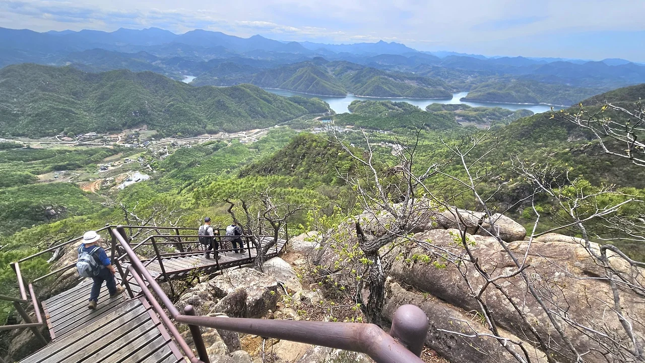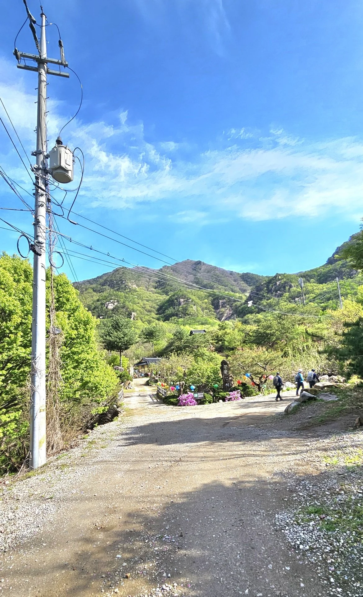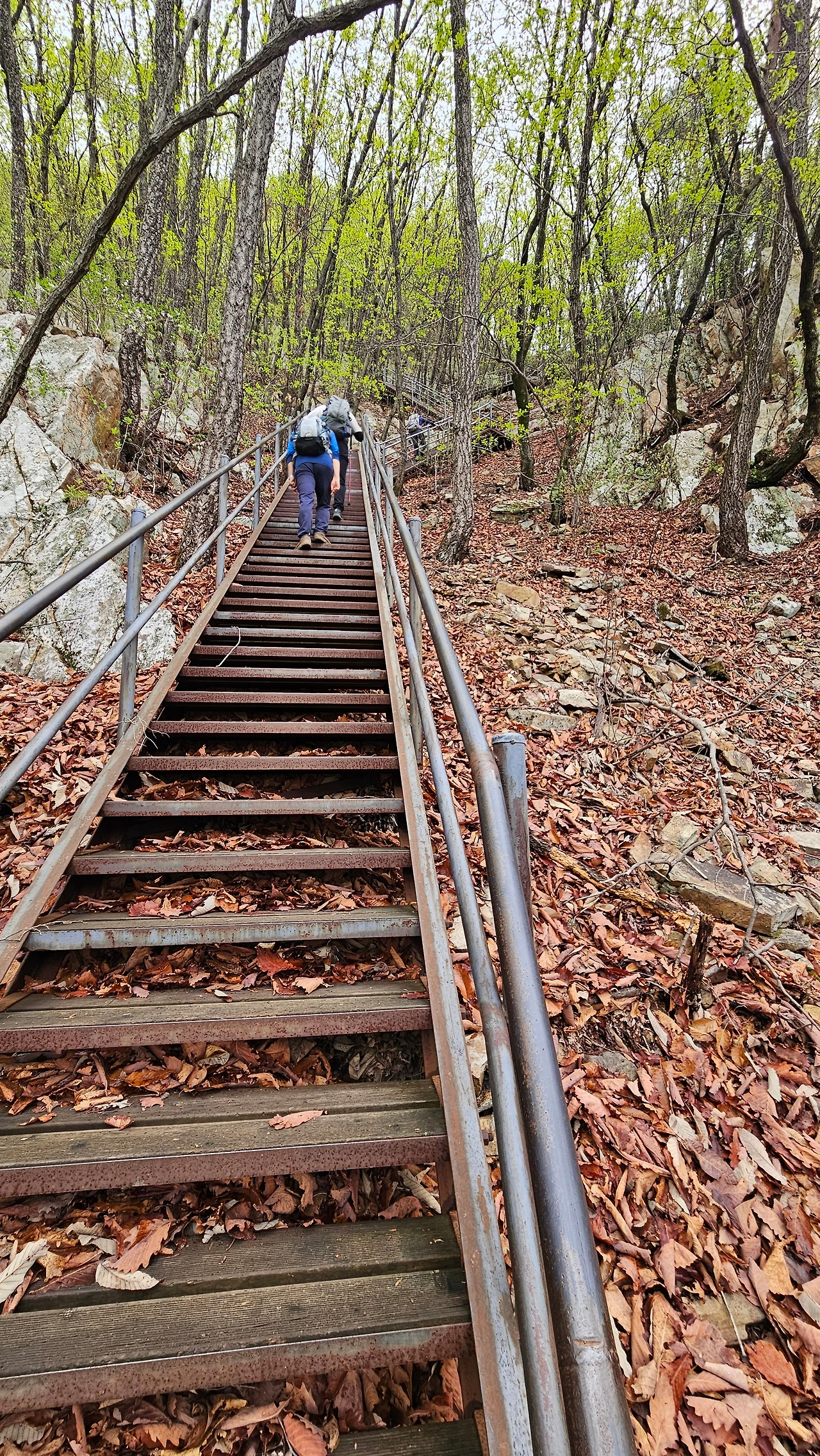 해발 497미터 지점에 서있는 이정표가 정상까지 1.5km가 남았다고 알린다. 그 아래 바위틈에서 금낭화가 수줍은 듯 발그레하게 얼굴을 붉히며 산객에게 인사를 건넨다. 왼쪽 이마 위로 모습을 드러낸 봉우리는 아득히 높고 멀어 보이고, 곧이어 나타나는 급전직하 아찔해 보이는 계단이 우측으로 휘돌며 정상을 향해 가파르게 고도를 높여 간다.