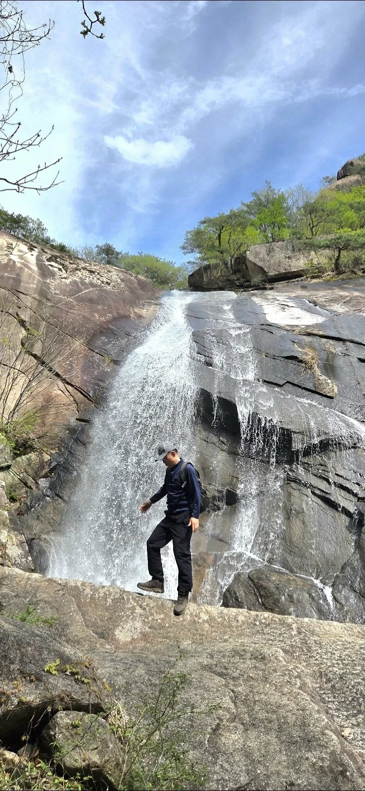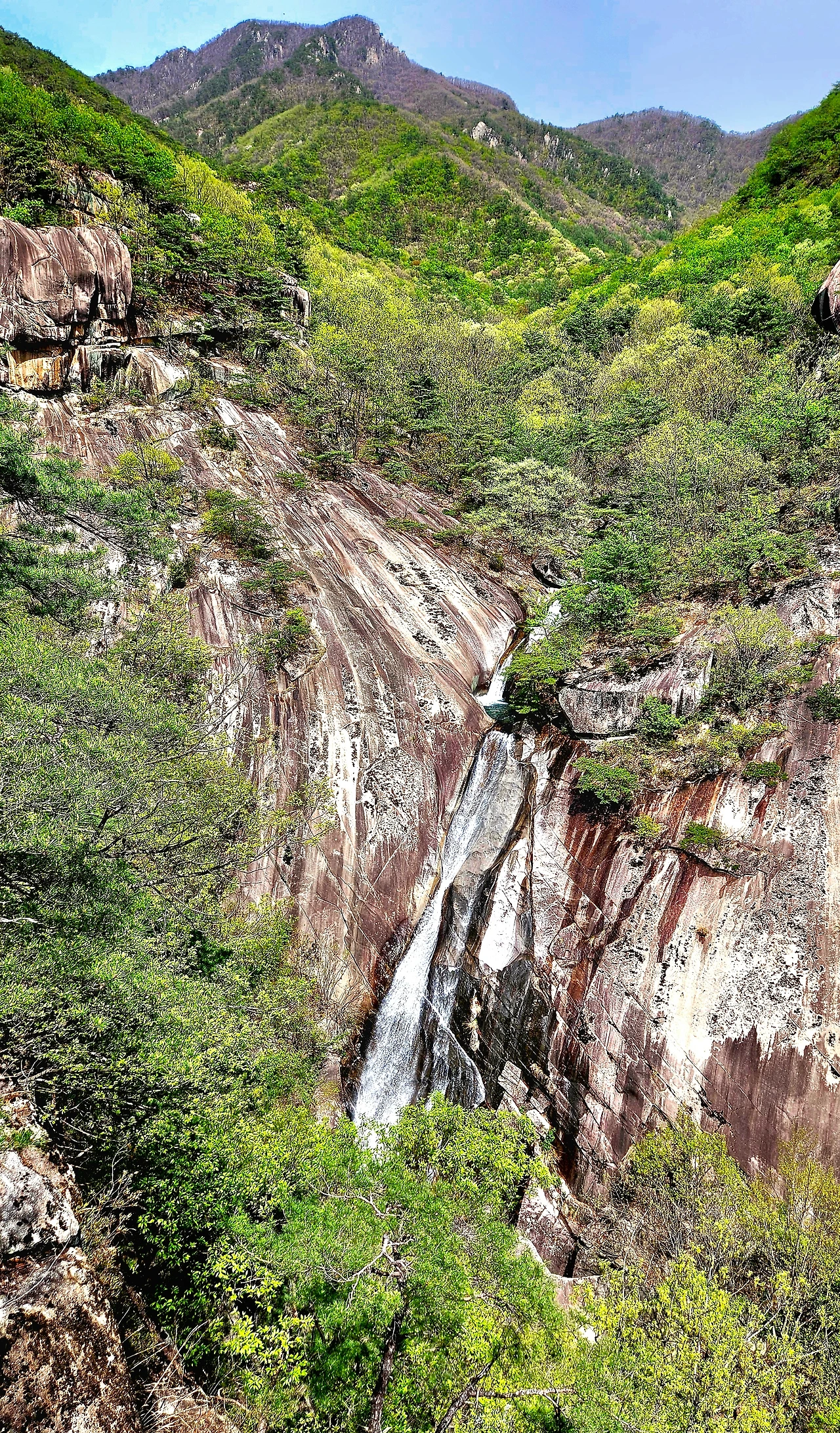 상천리 마을 위쪽 가장자리가 가까워질 무렵 철계단 좌측 아래로 용담폭포가 위용을 드러낸다. 깊이 파인 암반 사이에서 30m 높이 절벽 아래 웅덩이로 우렁찬 소리와 함께 세찬 물줄기를 쏟아 내리는 폭포는 가히 이번 산행의 백미라고 할 수 있다.