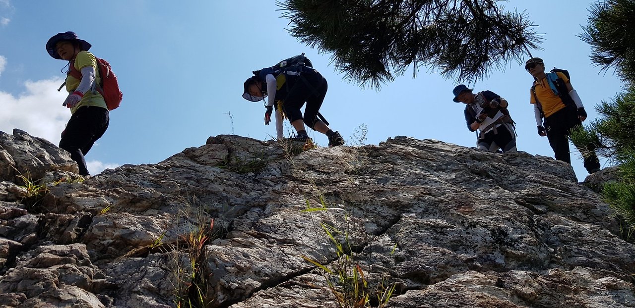 제7봉으로 오르는 능선은 잔뜩 성난 공룡의 등 비늘처럼 날이 선 암릉이다. 유난히 고사한 소나무가 많은 제7봉에서는 연이어 뒤따르던 사람들이 줄지어 서서 인증 숏을 찍기에 분주하다. 바위를 타고 내려와서 틈새로 파고든 소나무 뿌리를 보며 그 강인한 생명력에 혀를 내두른다.