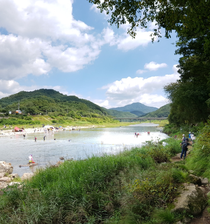 뭉게구름과 파란 하늘을 배경으로 숨겨 두었던 아름다움을 하나 둘 드러내며 뽐내는 팔봉산이 여덟 폭 동양화라면, 물비늘이 반짝이는 맑고 투명한 홍천강에서 물놀이 낚시 수영을 하는 사람들이 어우러진 모습은 그야말로 한 폭의 유려한 수채화다.