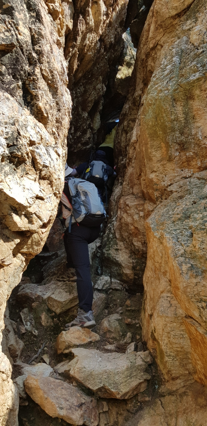 제3봉 정상 표지석은 멀찍이 물러선 산군 앞으로 펼쳐진 마을과 너른 들판을 내려다보고 있다. 제4봉으로 가는 길은 두 갈래로 그중 하나가 사방이 암벽으로 된 좁은 틈새로 올라가는 길로 '해산 굴'이라 불린다. 몸을 뒤틀고 발버둥을 치며 좁은 바위 틈새를 지나 땅 속에서 하늘로 치솟듯 오르는 힘겨움을 해산에 빗대어 이름 붙인 그 코스는 스릴과 재미와 웃음을 준다.