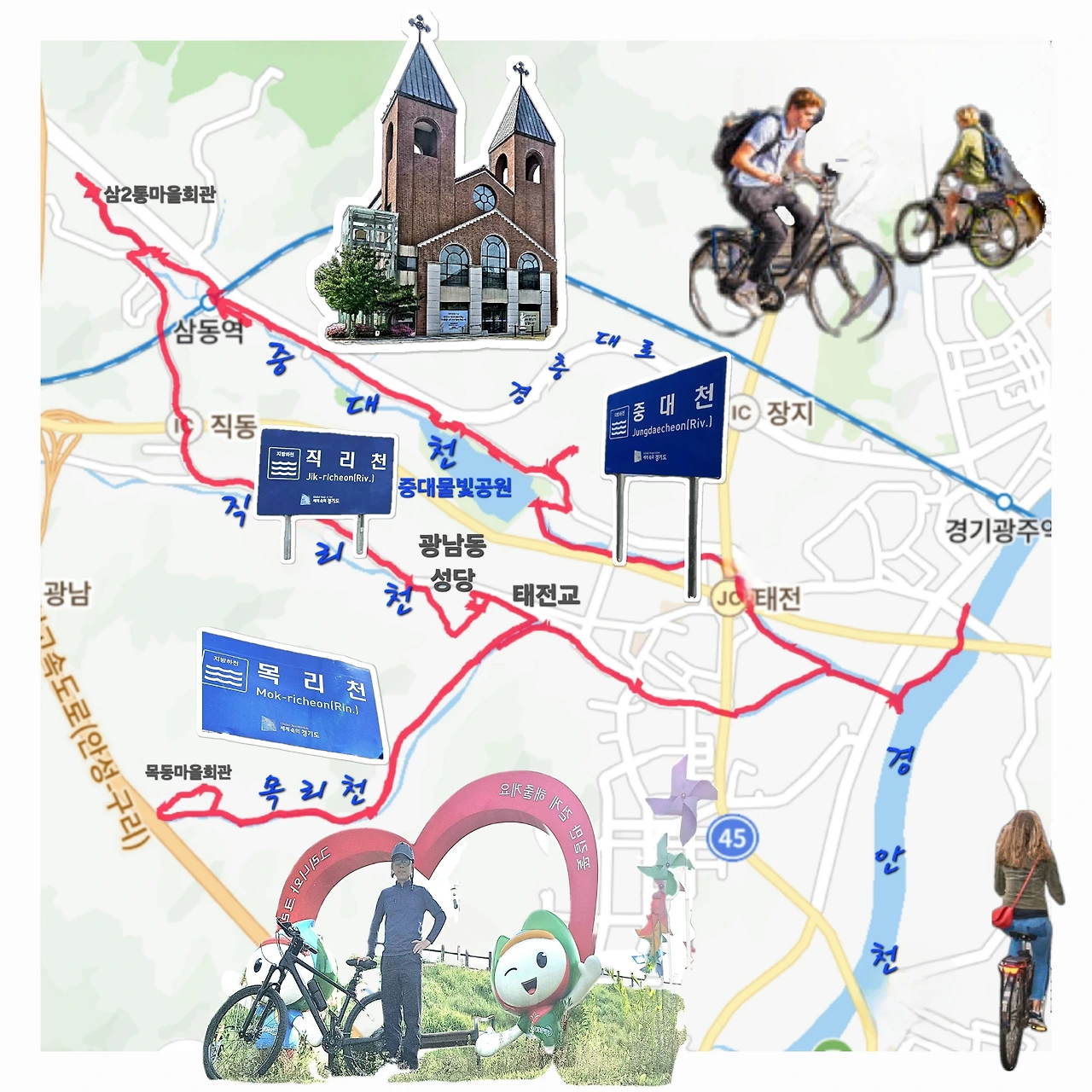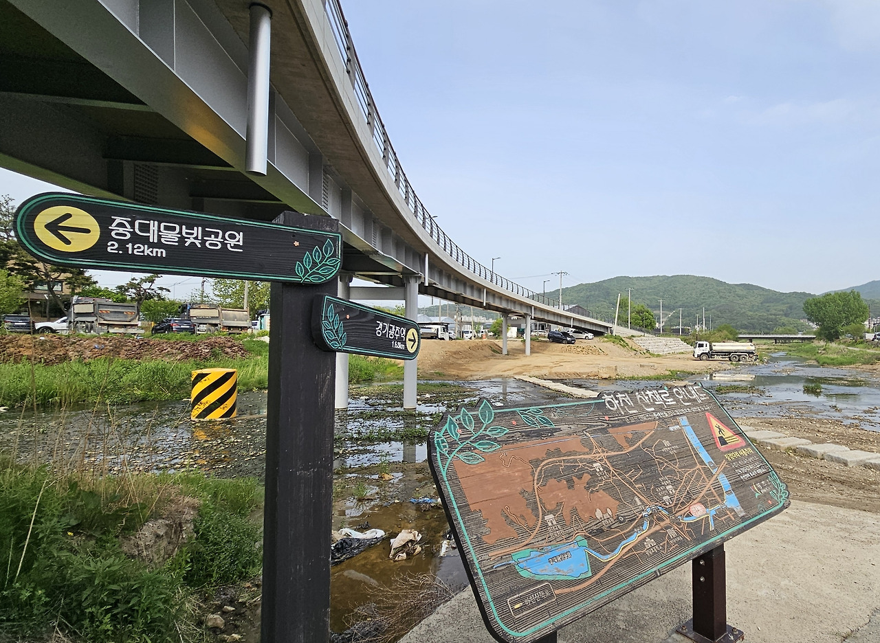 물빛공원을 뒤로하고 중대천 자전거길을 따라 강 건너에 자전거생태공원이 조성된 경안천 합수부까지 페달을 지쳐 달렸다.