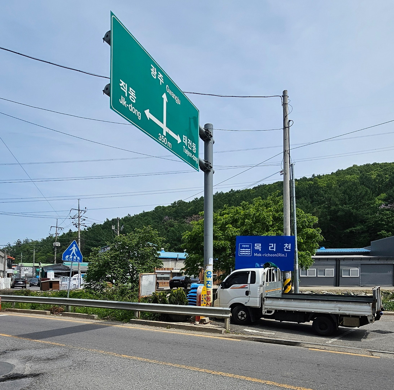 직리천은 그 중간쯤인 태전2동 마을회관 부근에서 목동에서 발원한 목리천을 끌어안는다. 기왕에 직리천 탐방 라이딩을 왔으니, 그 지류인 목리천도 둘러보기로 했다. 따로 자전거길이 없어 목리천 옆으로 나란히 난 광남안로를 따라 약 2.5km를 거슬러 올라가며 페달을 밟았다. 화물차량이 연신 오가는 2차선 도로 좌우로 각종 창고 정비소 소공업사 등이 줄지어 들어서서 도로와 하천을 가로막고 있다.