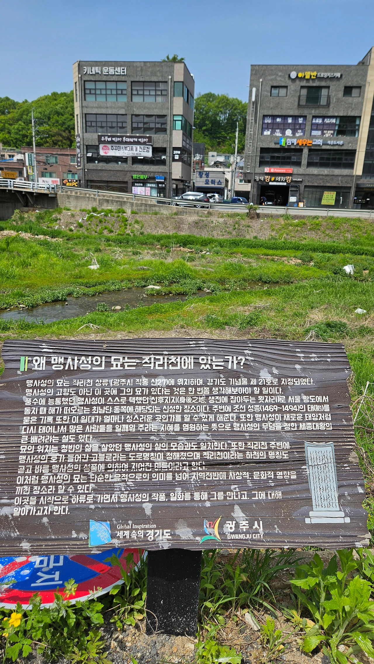 여기저기 공사가 진행 중인 직리천 천변 도로 가장자리에 일정한 거리를 두고 목재 표지판이 눈에 띈다. 그중 "왜 맹사성의 묘는 직리천에 있는가?"라는 제목의 표지판을 들여다보았다.