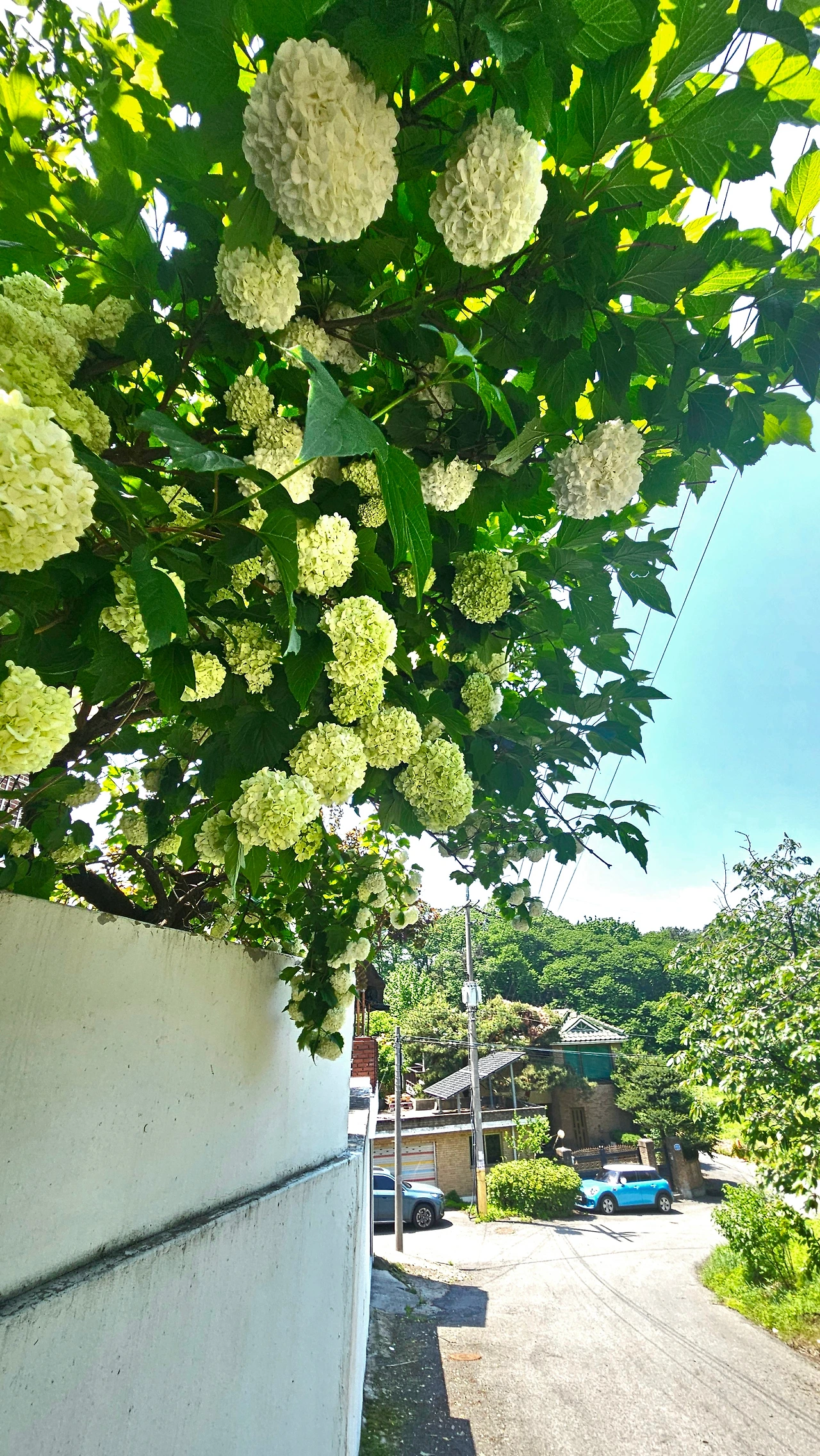 고목덤불산과 마준짝산 산정 옆으로 3번 국도 성남이천로가 관통해서 지나고 있다. 국도가 끊어 놓은 고목덤불산 능선에서 내려서니 두들로 전원주택의 불두화가 탐스러운 꽃송이들을 담장 너머로 고개를 내밀고 나그네에게 인사를 건넨다.