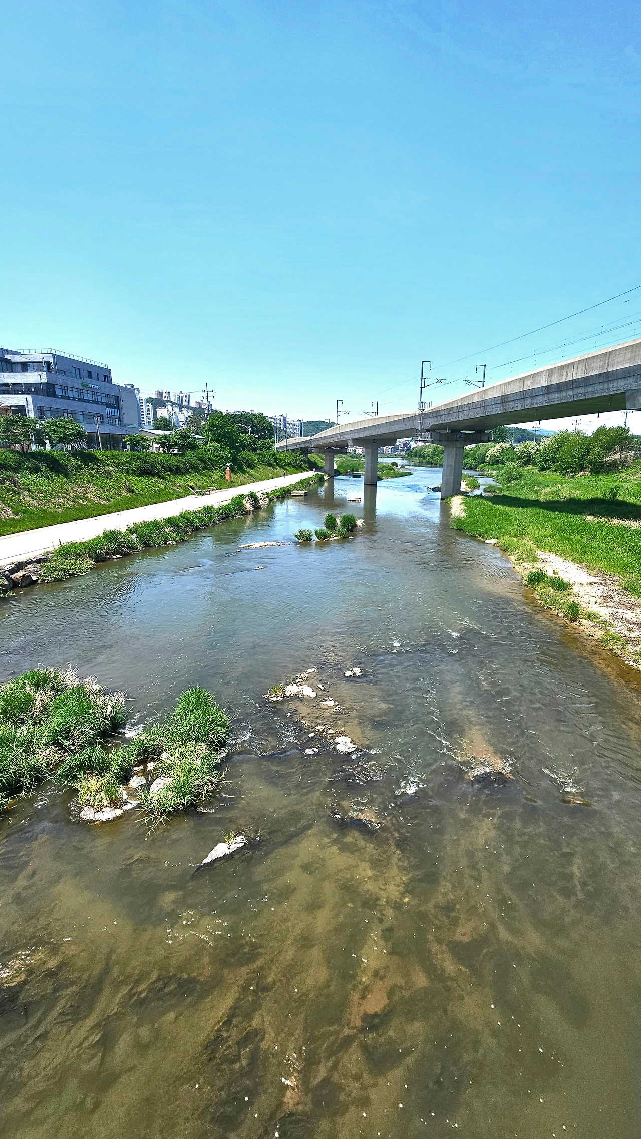 역사 옆 아카시아와 함께 숲을 이룬 붉은병꽃나무 아래 벤치 그늘에 앉아 썬크림을 바르고 나서 탐방의 발길을 옮긴다. 초월성신교회 옆 소로를 통해 곤지암천 천변도로를 거쳐 용수교를 건넜다. 지난주 라이딩을 했던 곤지암천이 녹음이 무성한 너른 제방에 발랄한 들꽃을 관객으로 앉혀놓고 경쾌하게 흐르며 합창을 들려주고 있다.