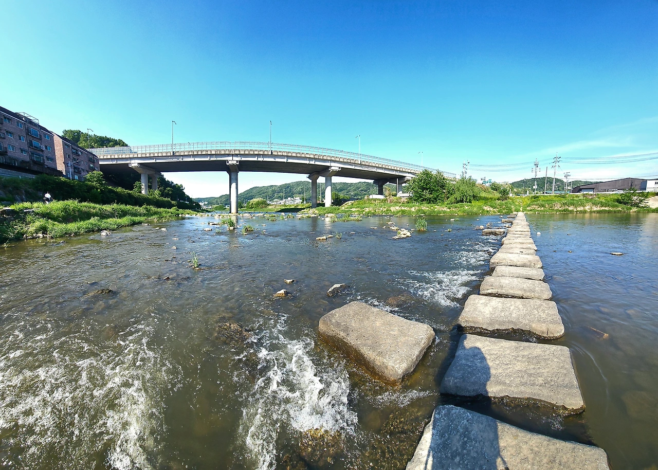철제 울타리로 둘러쳐진 사유지를 우회하여 곤지암천 지류인 학동천으로 내려서서 물 위로 삐져나온 돌을 징검다리 삼아 가까스로 반대편 도로로 올라섰다.