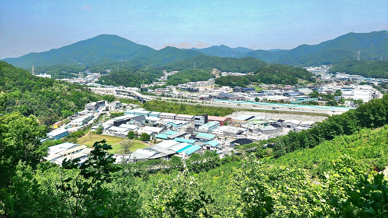 그냥 주저앉을 듯하던 산줄기는 뽕잎으로 잔뜩 배를 채우고 머리를 쳐든 채 미동도 않는 누에처럼 그 끝을 쳐들며 동우리봉을 솟구어 놓았다. 동우리봉은 깎여 나간 언저리 아래로 용수리의 조립식 건물군과 함께 좌측으로 산 줄기 사이로 햇빛에 반짝이는 곤지암천을 살짝 내보인다. 앞을 가로막는 넝쿨을 제치며 탈출로를 찾아 창고 공장 전원주택 등이 가로막고 있는 산자락 마을 가장자리로 다가갔다. 아니나 다를까 들려오는 견공의 짖는 소리를 멀찍이 피해서 용수리 마을로 내려섰다.
