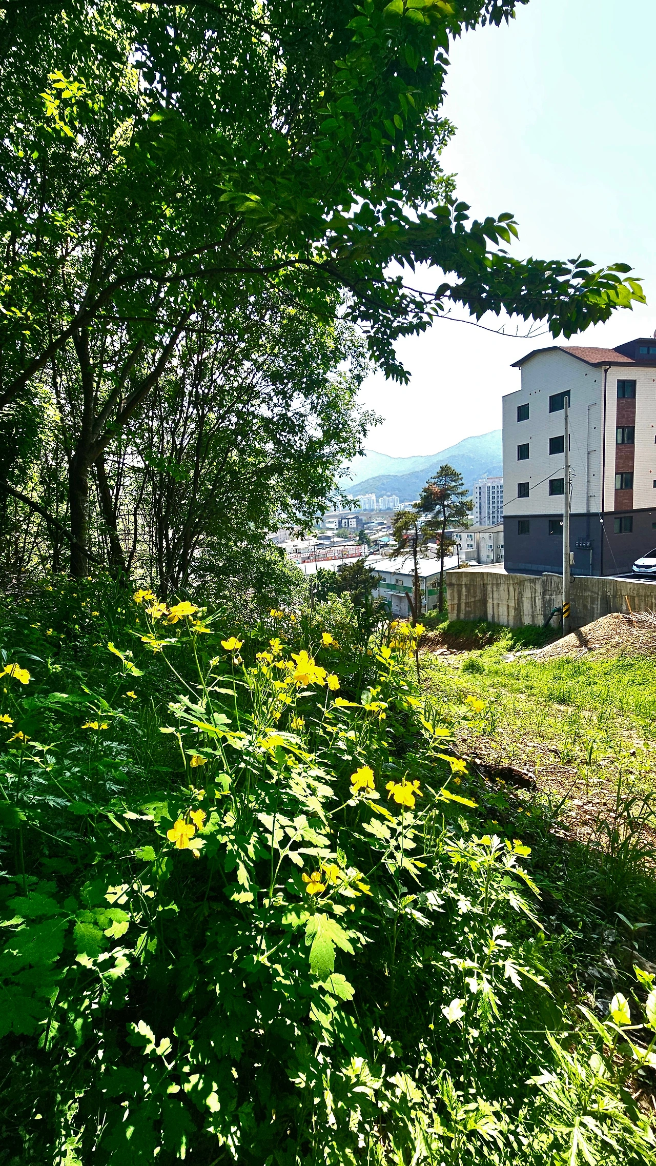 국수봉 남단 가장자리 전원주택 뒤로 난 들머리에서 노란 애기똥풀이 반긴다.