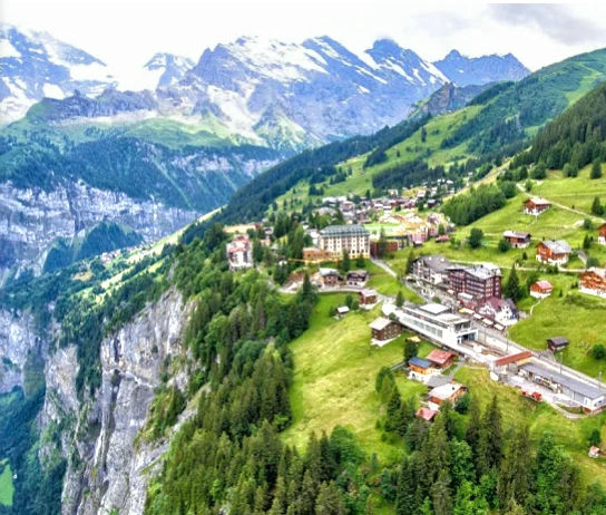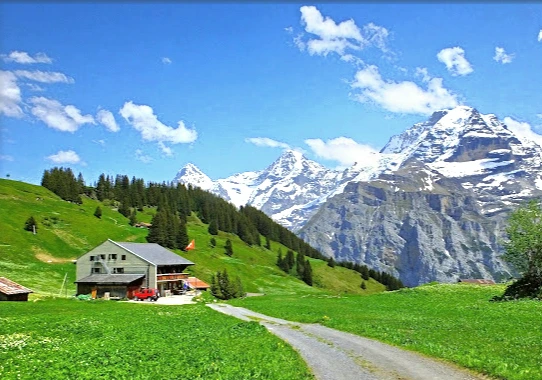 도착한 곳은 해발 1,600미터로 자동차조차 진입할 수 없는 마을 뮈렌(Mürren)이었다. 여름 햇살 속에서도 눈이 시릴 만큼 하얀 눈을 머리에 인 알프스의 3대 봉인 아이거(Eiger), 융프라우(Jungfrau), 뮌히(Mönch)가 나란히 깊은 계곡 건너에서 위용을 드러내고 있다. 마을 뒤로 넓게 펼쳐진 푸른 풀밭에서 자유로이 풀을 뜯고 있는 젖소 떼와 티 없이 맑은 하늘은 아름다운 한 장의 그림엽서나 다름없어 보인다.