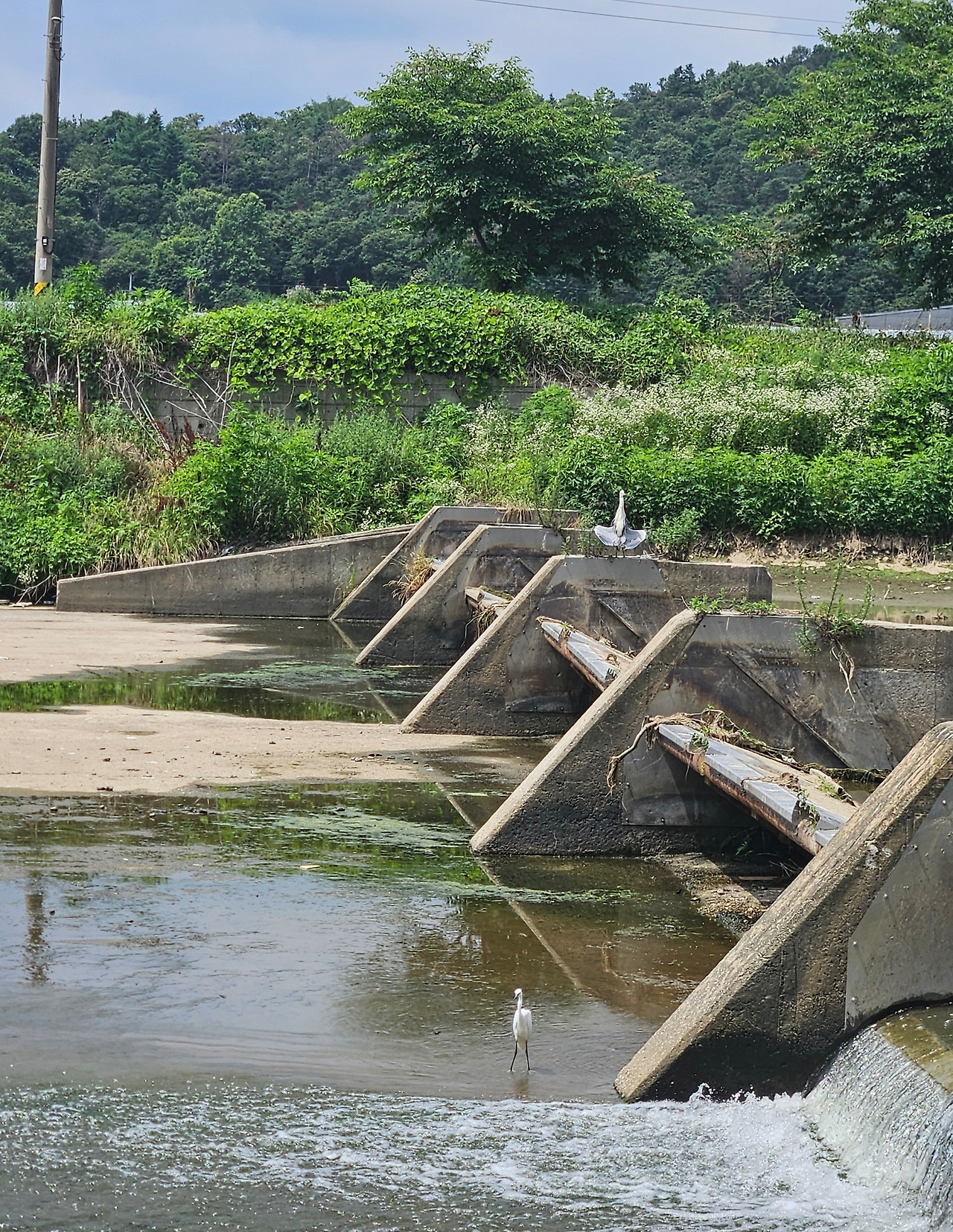 페달을 밟아 천천히 나아가는 자전거길 옆 방천은 온통 초록빛 풀숲으로 덮여 있다. 백로는 고요히 물속을 바라보고, 보 위에 앉은 해오라기 한 마리는 날개를 반쯤 펴서 햇살을 즐기고 있다. 그 곁에서 오리들은 물질에 여념이 없다. 좌측 멀리 정관산, 우측으로 문형산의 여러 갈래로 뻗어 내린 산줄기가 눈에 들어온다.