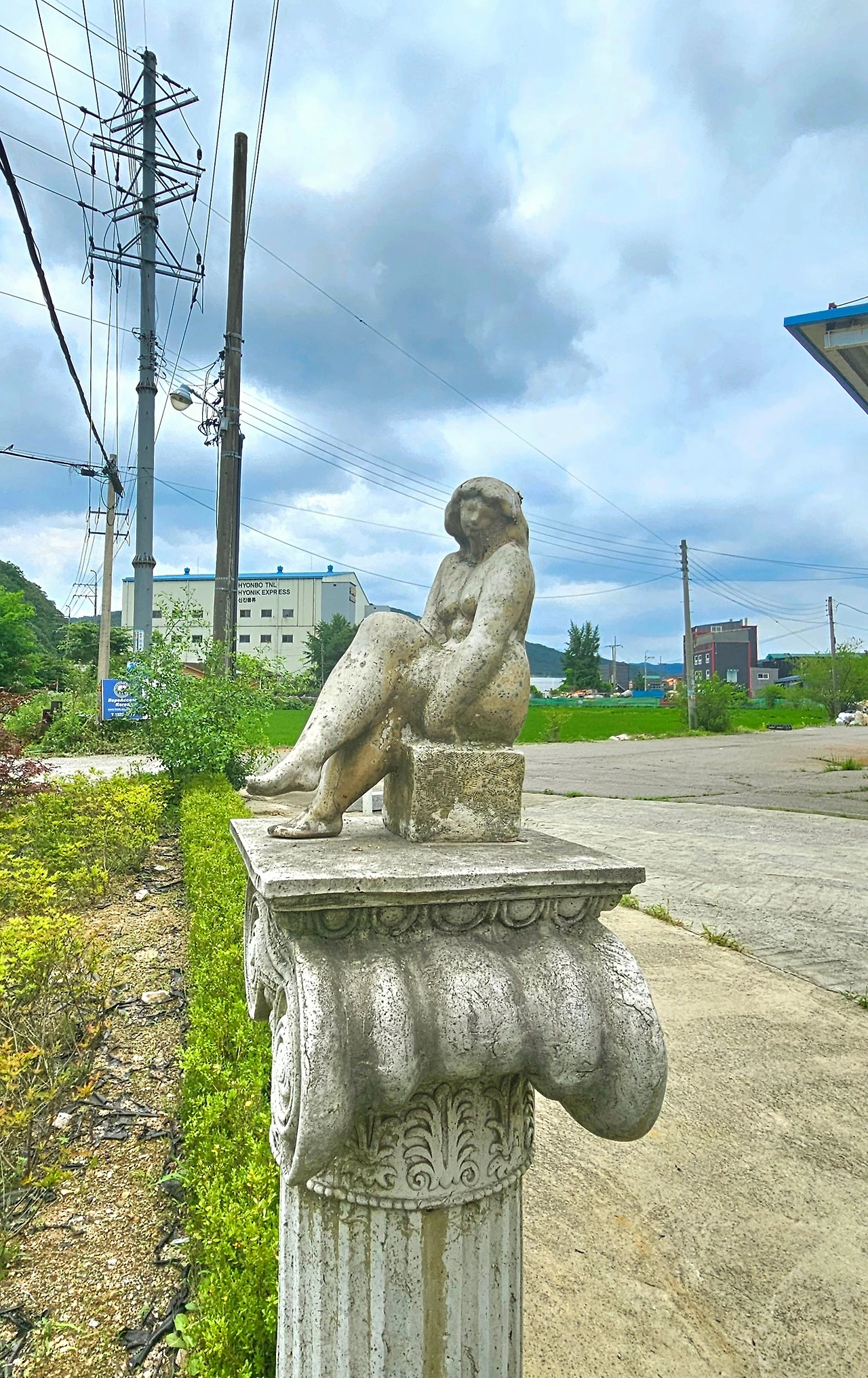 용인에서 광주로 경계가 바뀌는 지점, 경계라는 것은 늘 그렇듯 관심과 배려가 소홀하다. 이처럼 자전거길이 뚝 끊긴 것도 결국은 님비(NIMBY)식 행정의 그림자 아닐까. 맞은편 천변도로도 어느 창고 앞에서 멈췄다. 대한로프구조협회 창고 앞에는 신고전주의 양식의 기둥과 그 위 여인 조각 모형이 한동안 시선을 붙잡았다.