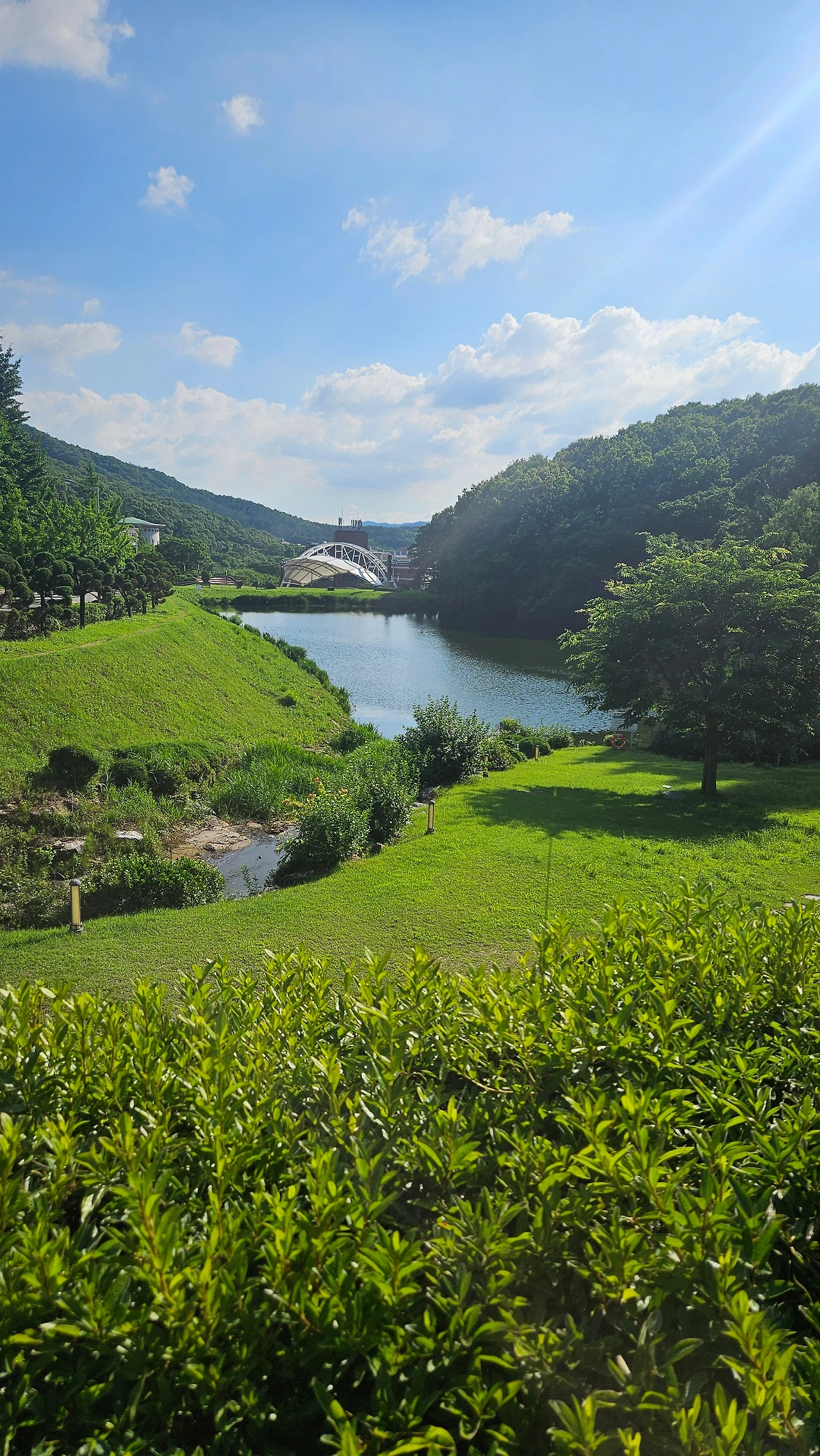 포은의 묘역을 뒤로하고, 그 부근에 자리한 토루처럼 생긴 등잔박물관의 외관을 한 번 둘러본 후, 능원리 마을 오산천 나무데크 위로 다시 페달을 밟았다. 하천 건너 푸른 능선과 구름이 어울린 하늘을 등지고 우뚝 솟아 있는 콘크리트 생산 설비가 생경하다.