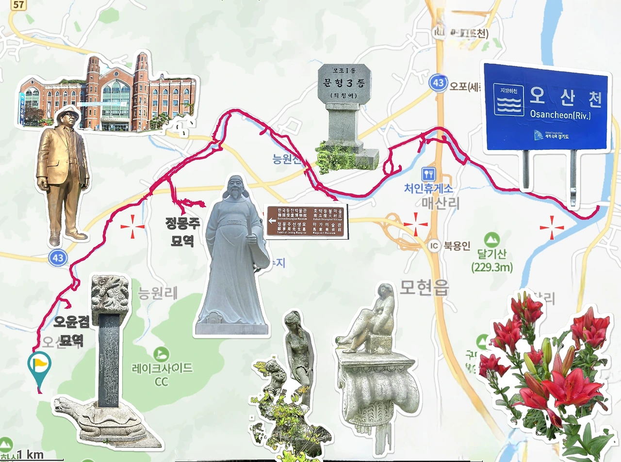 오산천 하류로 되짚어 내려가는 길은 한결 수월하다. 능원교 옆 능소화가 햇볕에 지친 듯 고개를 떨군 모습이 꼭 라이딩과 강렬한 햇빛에 지친 내 모습 같다. 포은교 다리 아래 자전거를 세우고 벤치에 앉아 솔솔 부는 바람에 땀을 식혔다. 오산천이 경안천으로 흘러드는 지점, 출발점으로 되돌오며 오늘의 라이딩 미션을 클리어한다.