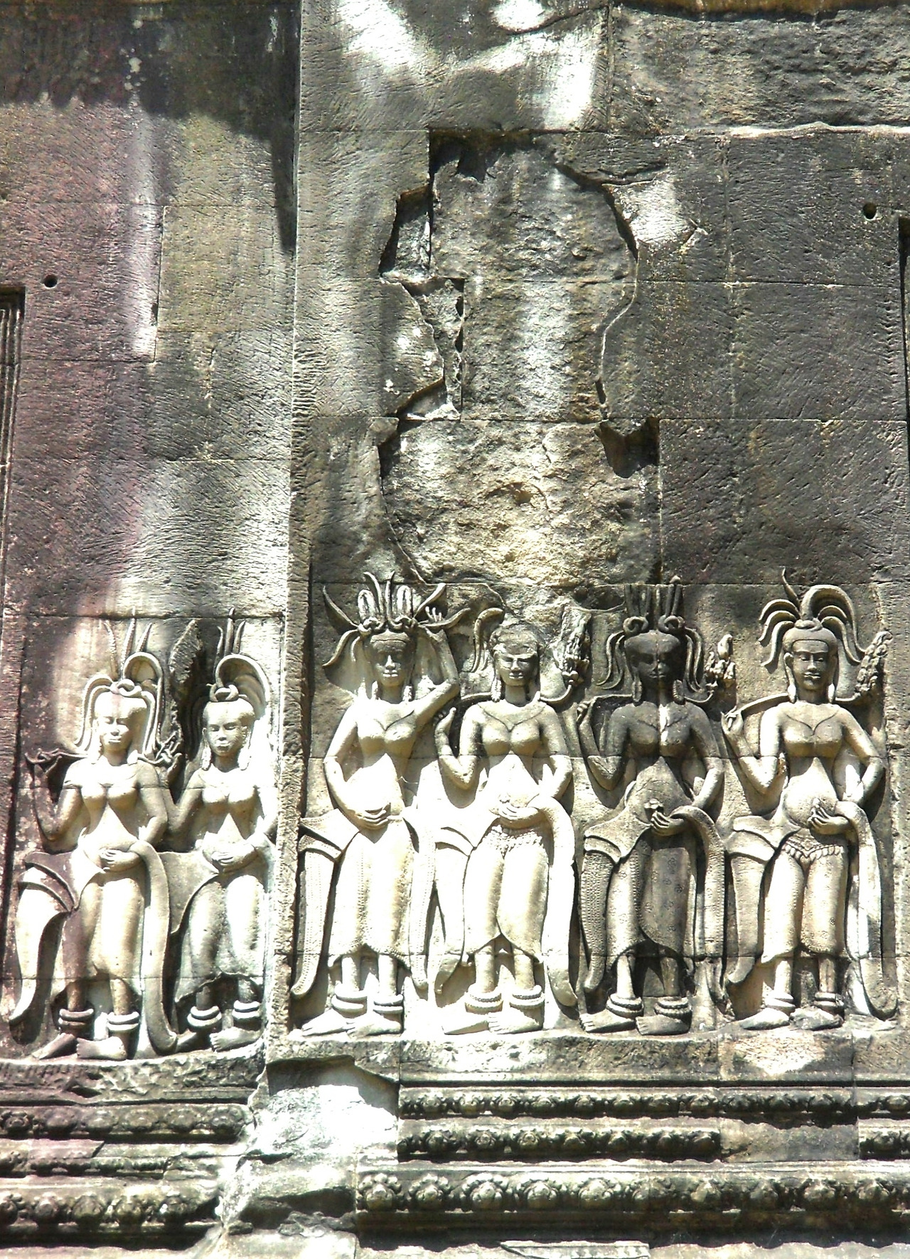 사원 내 벽면과 기둥, 사방으로 뻗은 회랑에는 수천 개의 압살라(Apsara) 부조를 비롯해, 인간과 신, 악마가 뒤엉켜 싸우는 장면들이 장대한 파노라마처럼 이어진다. 코끼리와 마차, 궁수와 창병들이 빼곡히 새겨진 수백 미터에 달하는 부조는 힌두교 신화 속 전투를 마치 살아 움직이는 듯 생생히 그려내어, 보는 이를 압도한다.