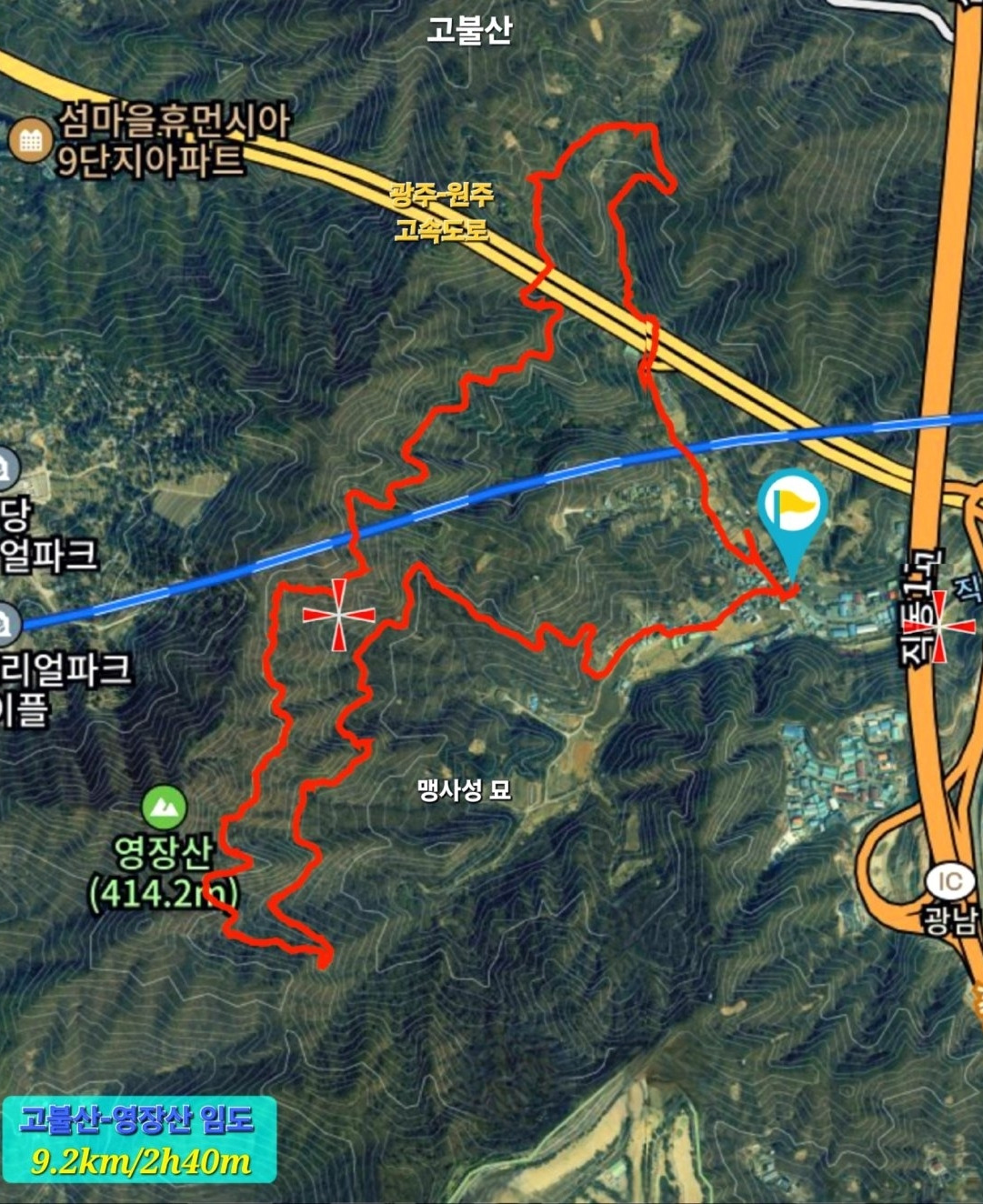 임도는 깊은 골짜기를 따라 휘돌며 저 멀리 광주 시가지를 살짝 드러내 보여 주었다. 칡넝쿨이 나뭇가지를 타고 임도 위를 터널처럼 덮었다. 2.17km 지점에 도착하자 이정표가 고불산 임도가 여기서 끝나며, 이제부터는 1.29km 길이의 영장산 임도가 이어진다고 알린다.