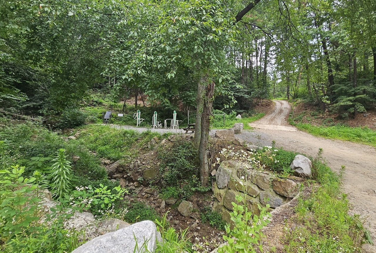 쉴만한 벤치 하나가 그리워질 즈음, 계곡 위 작은 다리 건너편에 탁자와 벤치가 놓인 정자가 나타났다. 배낭에서 참외를 꺼내 허기를 달래며 새소리에 귀를 기울였다. 오른편 가파른 사면을 낀 정자 부근 임도는 황톳빛으로 새로 정비돼 바퀴자국이 빼곡했다. 가는 빗방울이 떨어지기 시작했고, 숲 속에서 산비둘기가 꾹 꾹 울었다.