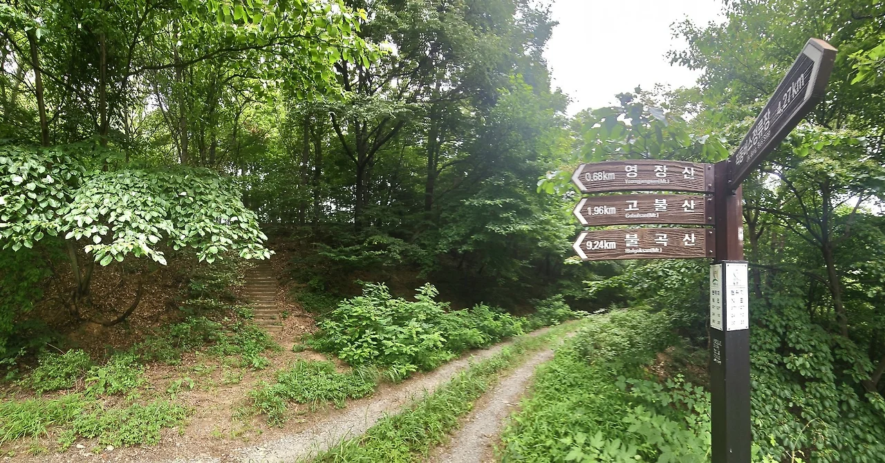 솔솔 부는 바람을 맞으며 모퉁이를 돌자 영장산 임도로 접어들었다. 숲은 더욱 빽빽해졌고, 임도는 자동차 바퀴 자국만 흙이 드러난 채 잡초로 덮였다. 영장산 정상 턱밑으로 깊게 파고드는 임도는 완연한 산중 같아, 인공의 소리가 사라지고 숲만의 숨결이 느껴졌다. 오른편으로는 영장산으로 오르는 계단이 나타났다.