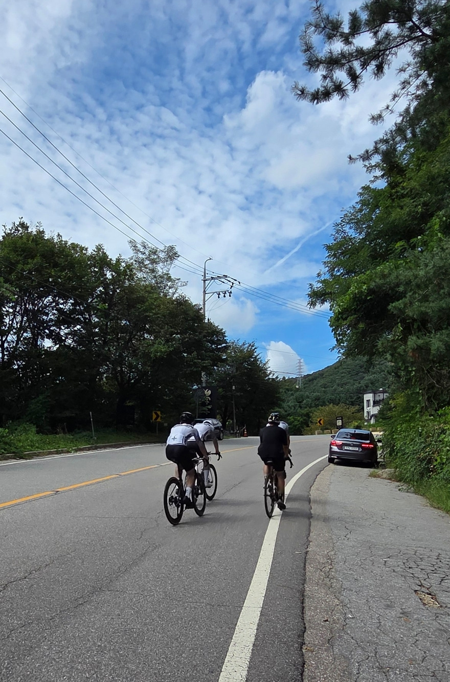운중저수지를 지나 하오재 고갯길로 오르는 비탈길이 숨을 차오르게 하고 결국엔 나를 안장에서 끌어내렸다. 고개 위쪽에서 라이더들이 고개 아래로 연신 씽씽 스쳐 지나고, 건장한 라이더 한 무리가 고개 위로 페달을 지쳐 오른다. 땀이 헬멧을 타고 뚝뚝 흘러내리지만, 뒤이어 올라오는 라이더 뒤에 따라붙으려 안장에 올라 페달을 밟았다.