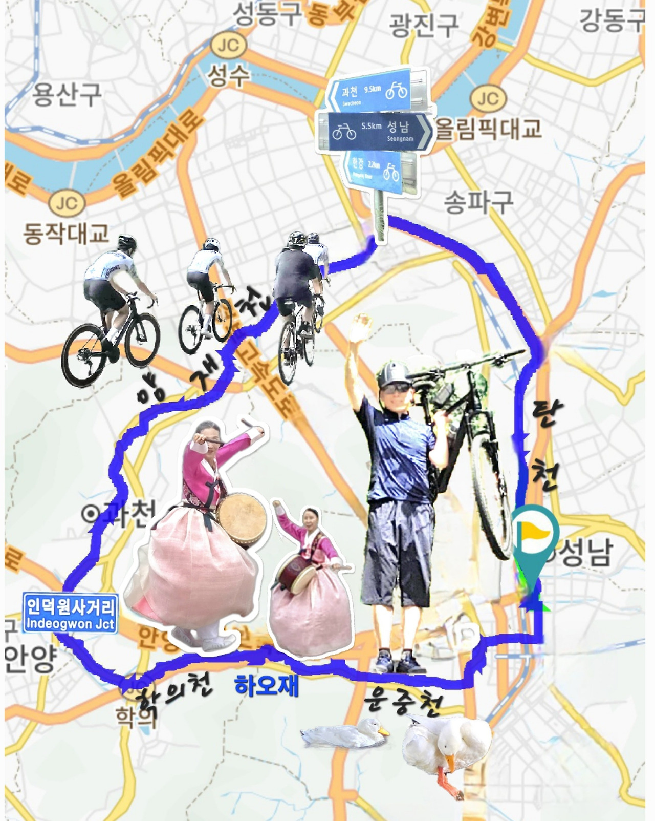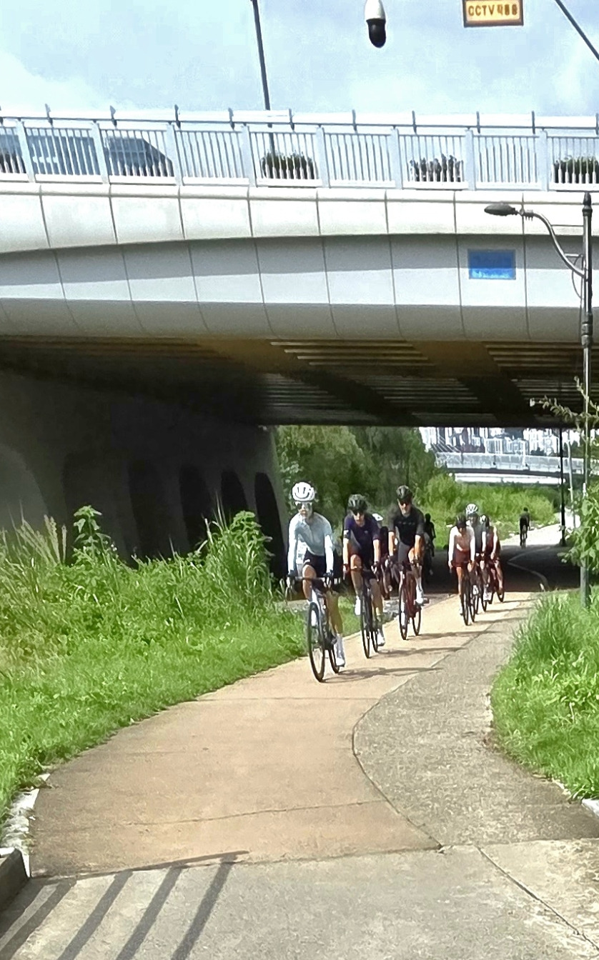 다리가 점점 무거워지고 온몸이 뻐근해질 즈음, 양재천이 탄천과 만나는 지점에 다다른다. 그 부근 파크골프장에서 경기를 즐기는 노인들의 모습이 활기차 보인다. 마지막 힘까지 모두 쏟아부어 페달을 밟아, 마침내 원점인 탄천운동장 부근에 도착했다.