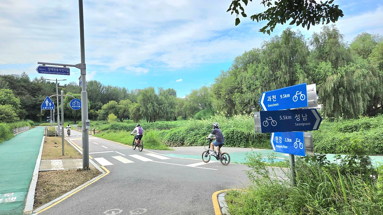 과천대로를 따라 관악산과 청계산 사이에 포근히 안겨 있는 과천 시내로 들어섰다. 어느덧 여정의 중간 지점쯤이다. 과천중앙공원을 지나 양재천 자전거도로로 내려서서 경쾌하게 흐르는 물소리와 함께 다시 페달을 밟았다. 양재천 위에 놓인 여러 다리들을 이리저리 건너며 하류 쪽으로 달린다. 제방의 무성한 풀숲 사이에 가을의 전령 코스모스도 간간이 눈에 띈다. 영동 2교 부근 쉼터에서는 버스킹 음악과 산들바람에 몸을 맡긴 채 시민들이 삼삼오오 모여 앉아서 휴식을 취하고 있다.