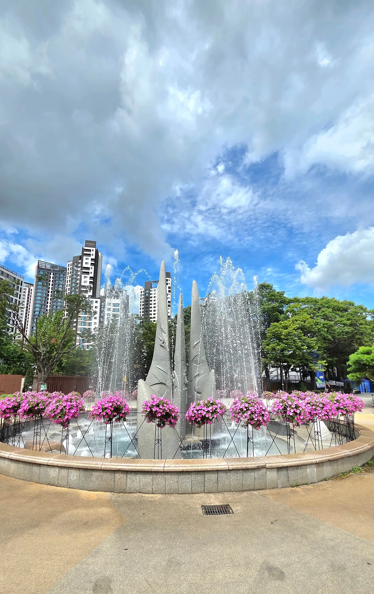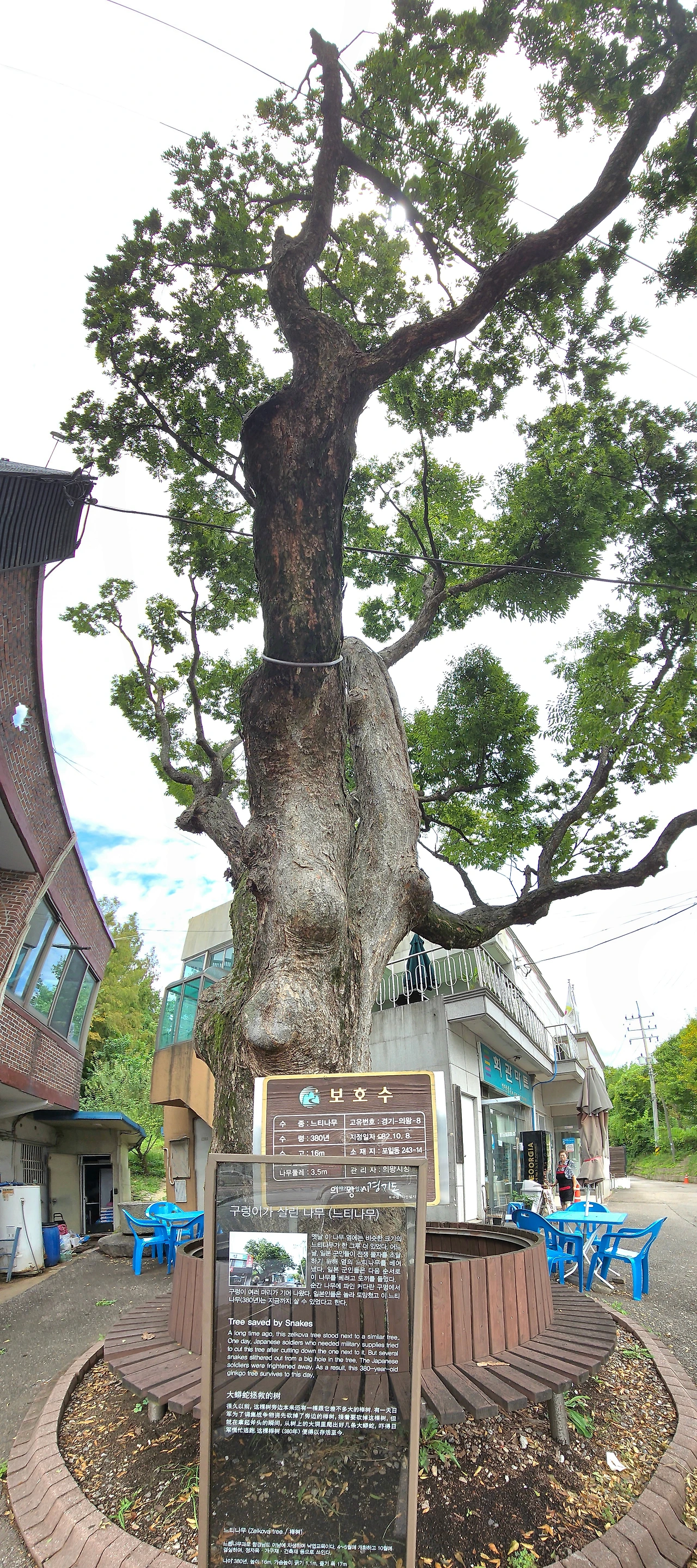 하오재 고개 내리막길이 다하고 학현로입구사거리 건널목을 지나 학익천 천변도로로 들어섰다. 학익천으로 접어드는 길목에서 화사하게 피어 있는 무궁화 꽃을 카메라에 담았다. 포일동 꽃집 앞에 줄지어 놓인 화분의 국화는 아직 봉오리를 꼭 다물고 있었지만, 곧 가을의 향기를 풍길 준비를 하고 있었다. 서울구치소 삼거리의 380년 된 느티나무 그늘 아래 앉아 잠시 숨을 골랐다. 느티나무 맞은편 공사장 가림막에 걸린, 웃픈 계엄을 연출했던 장본인을 석방하라고 쓰인 플래카드가 쓴웃음을 머금게 한다.