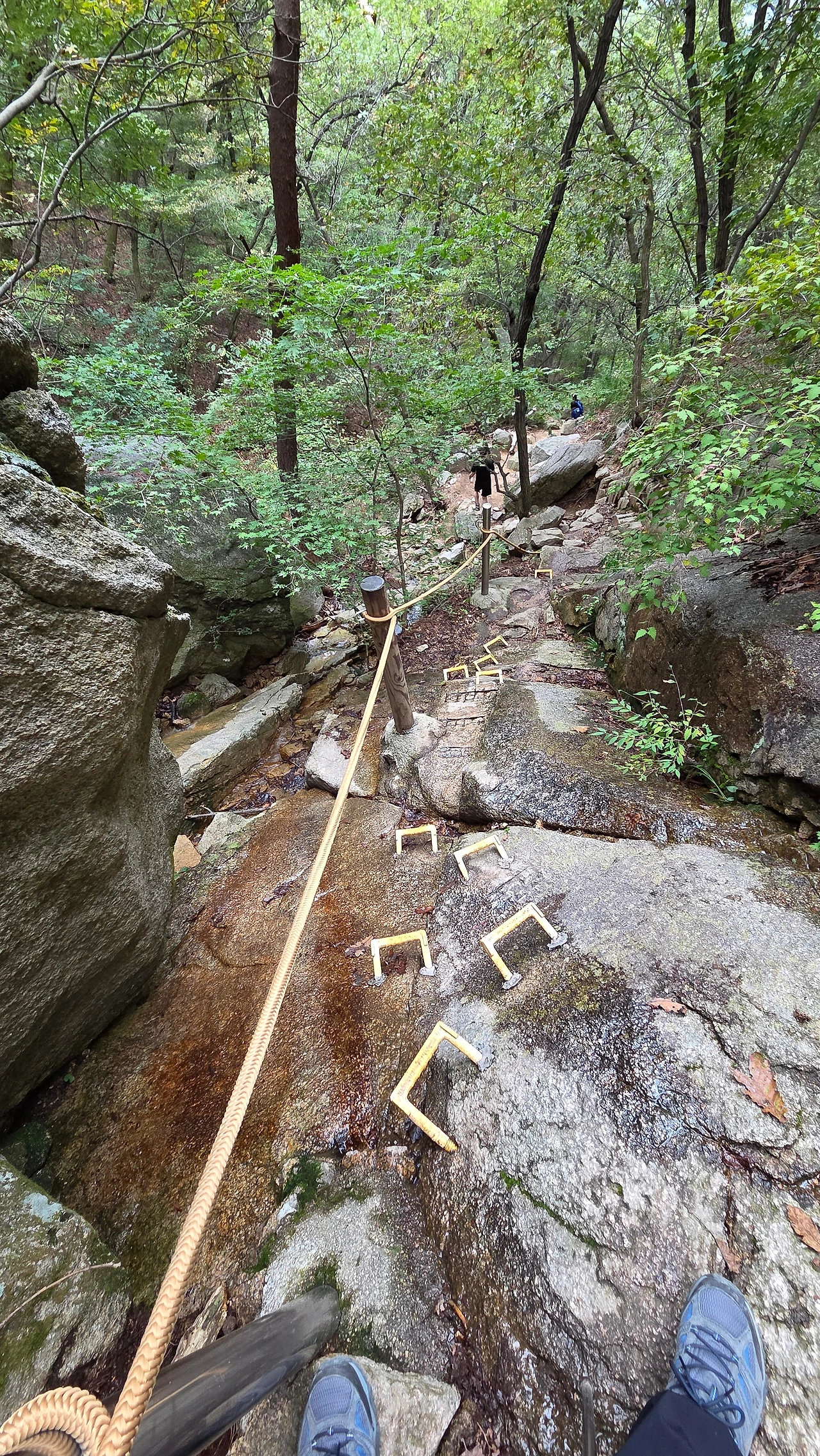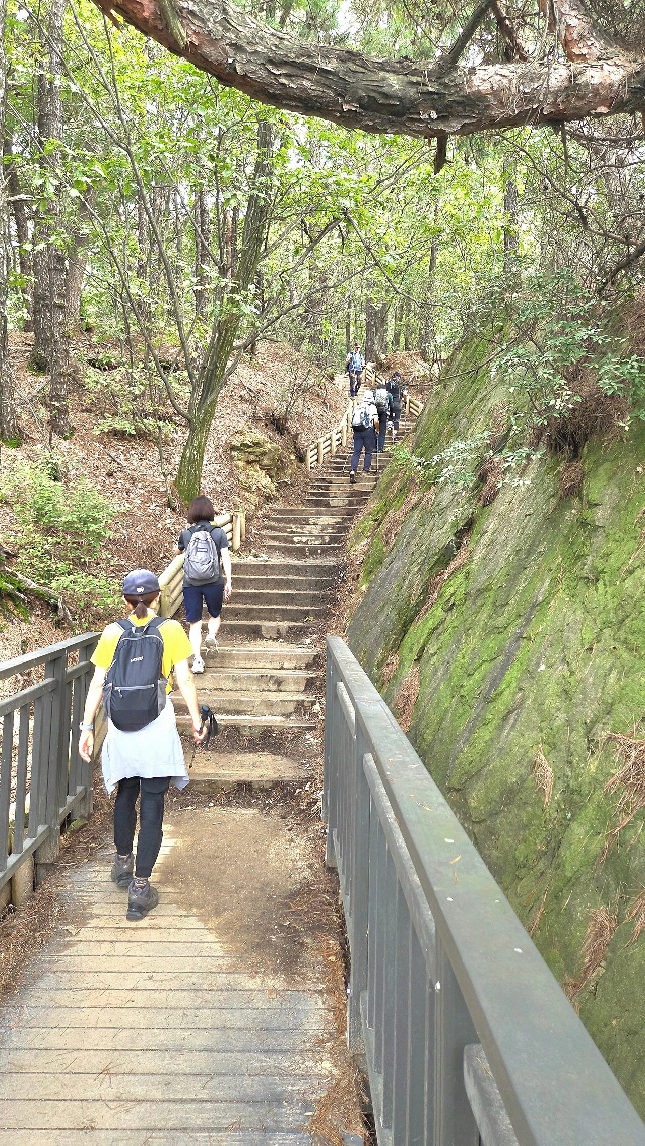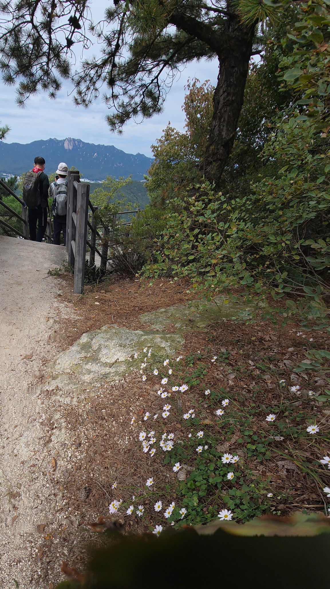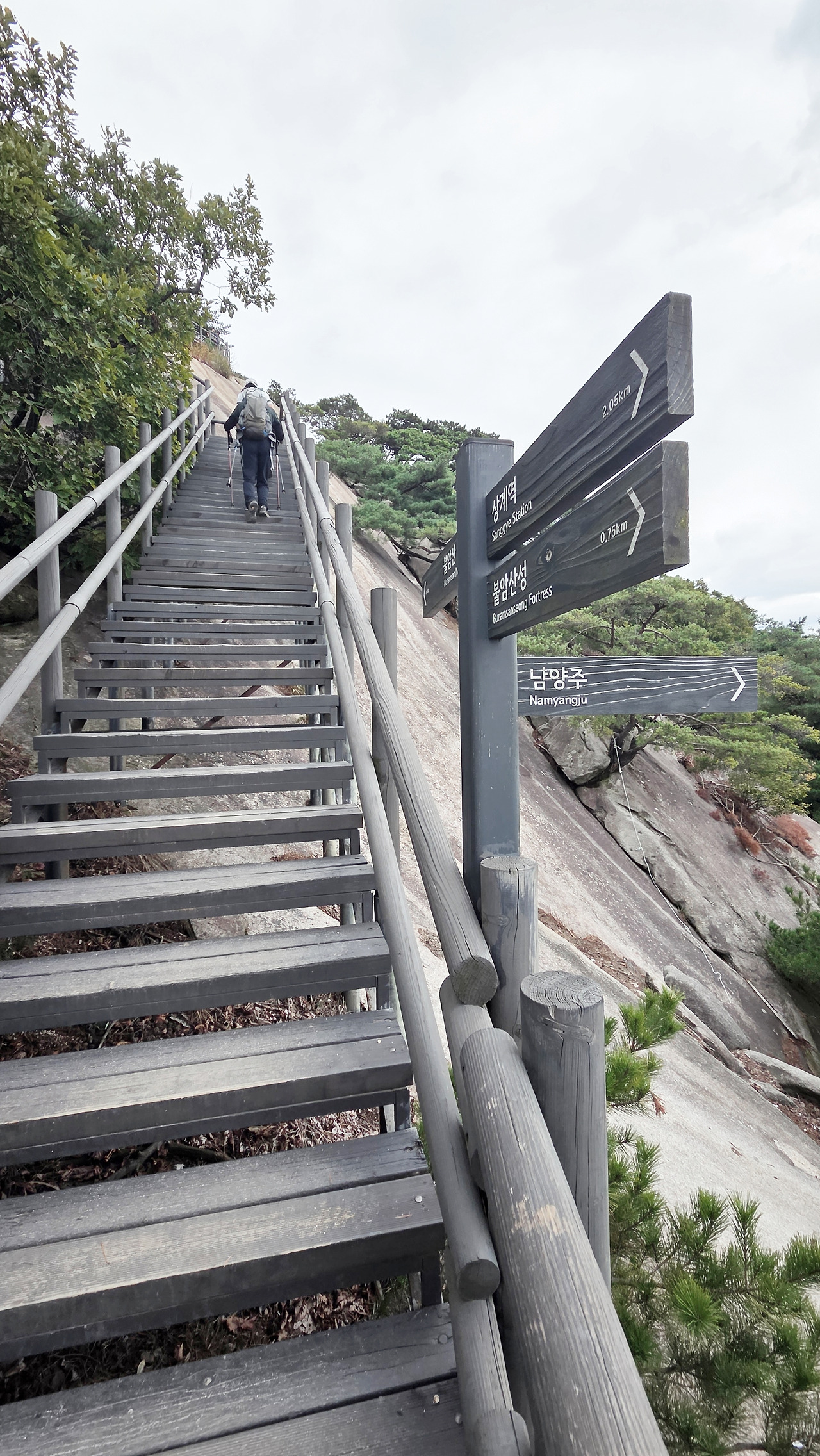 하늘은 가늘게 비를 흩뿌리다가 멈추길 반복했고, 내려가기에도 힘겨운 그 길로 올라오는 산객들이 몇몇 스쳐 지난다. 부슬부슬 비가 뿌리는 날씨에 일몰 시각도 머지않은 늦은 오후에 산정으로 향하는 그 산객들의 용기가 가상하기도 하고, 산을 너무 가볍게 여기지는 않나 걱정이 되기도 했다.