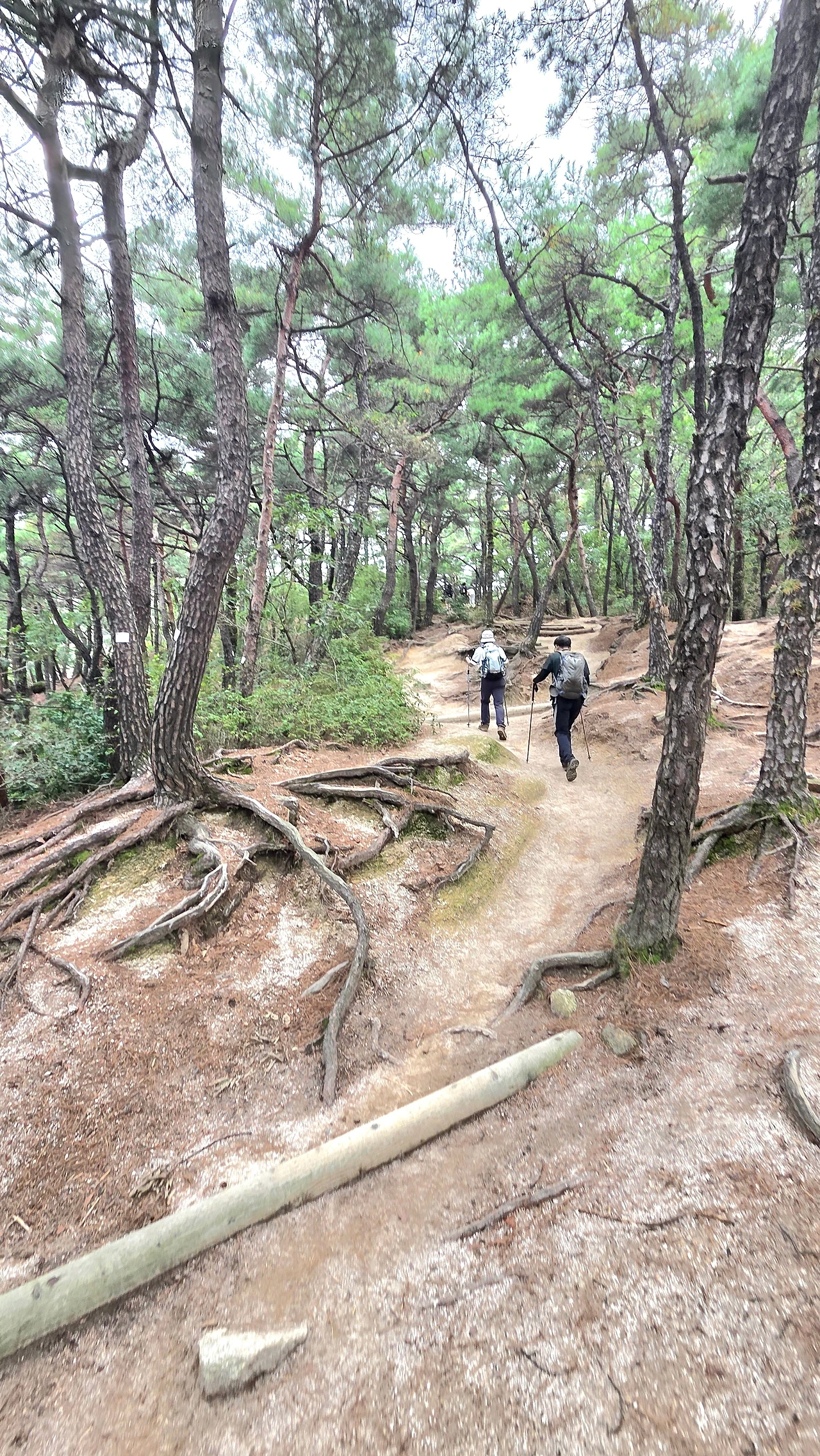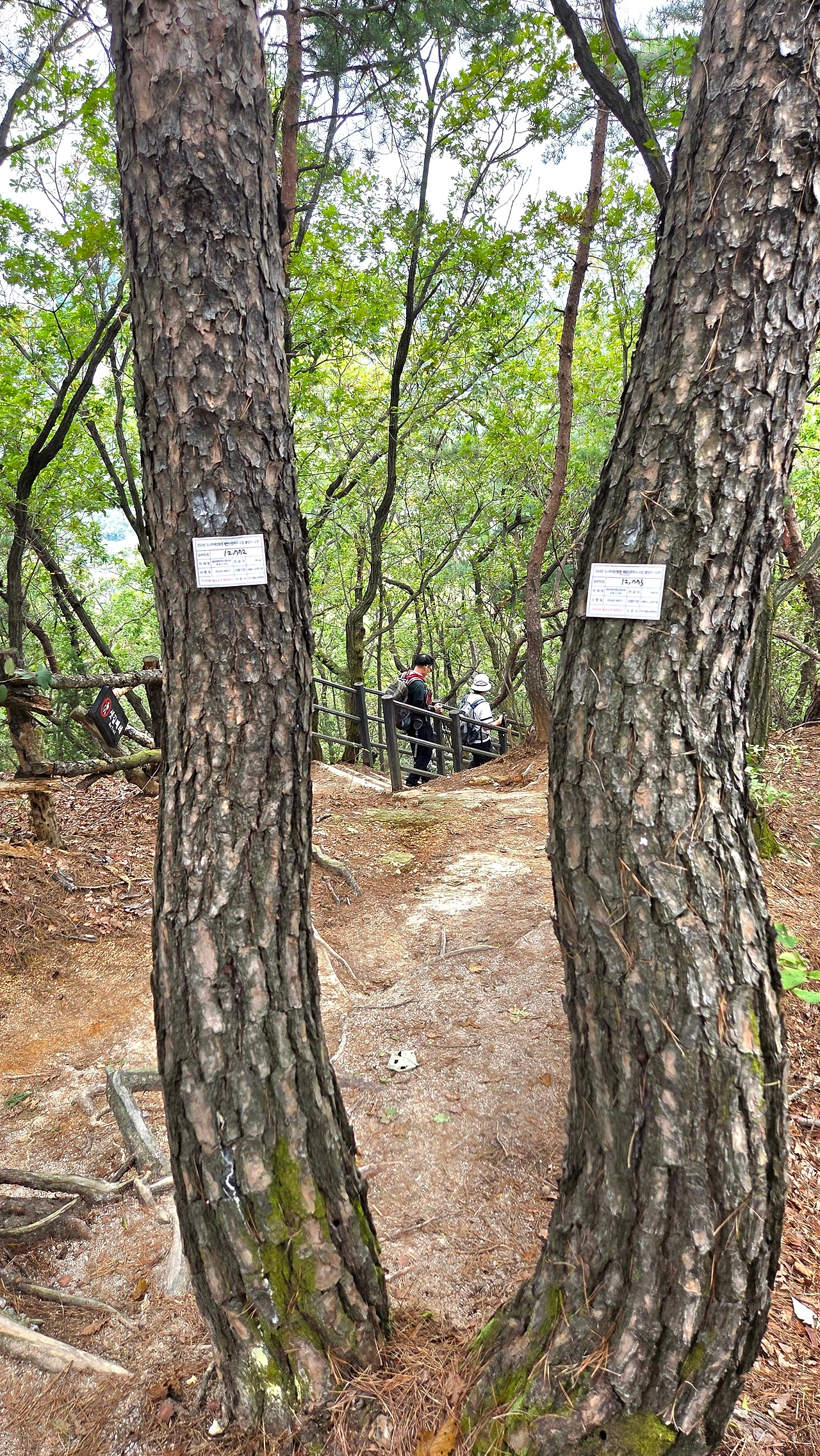 다람쥐 광장을 지나며 평탄한 우회 등로를 외면하고 암릉을 따라 오른 석장봉 위에 앉아 배낭 속 요깃거리로 허기를 달랬다. 짧은 암릉을 릿지 등반하듯 내려서니 완만한 흙길이 기다리고 있다. 등로 좌우의 소나무들이 흰 꼬리표를 하나씩 달고 있는데, 재선충 예방주사를 맞았다는 표시다. 자연에 대한 우리 인간들의 최소한의 배려랄까.