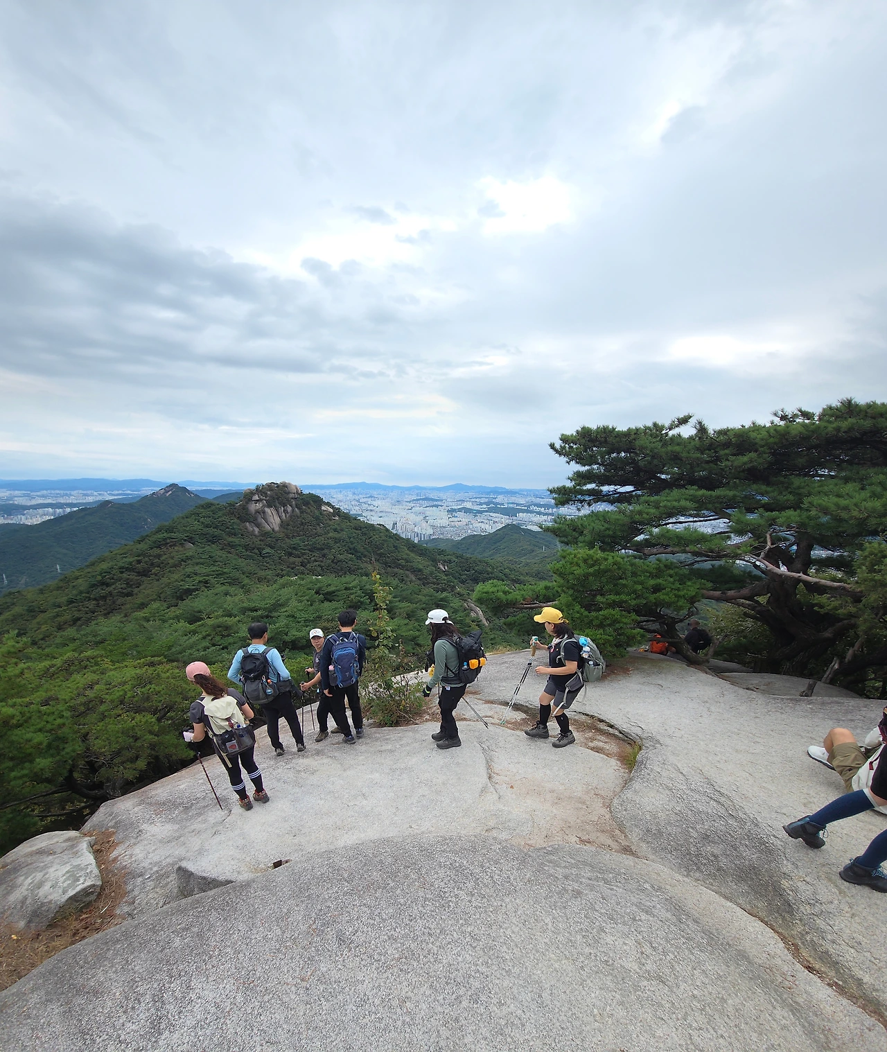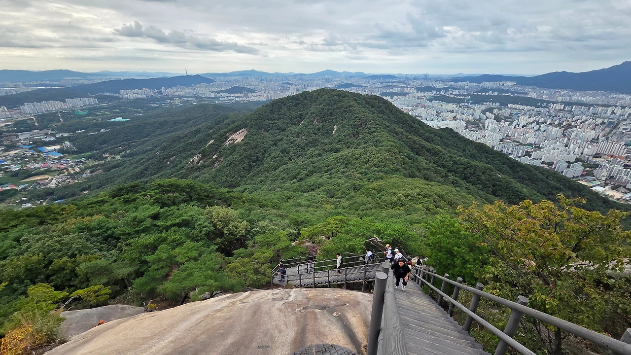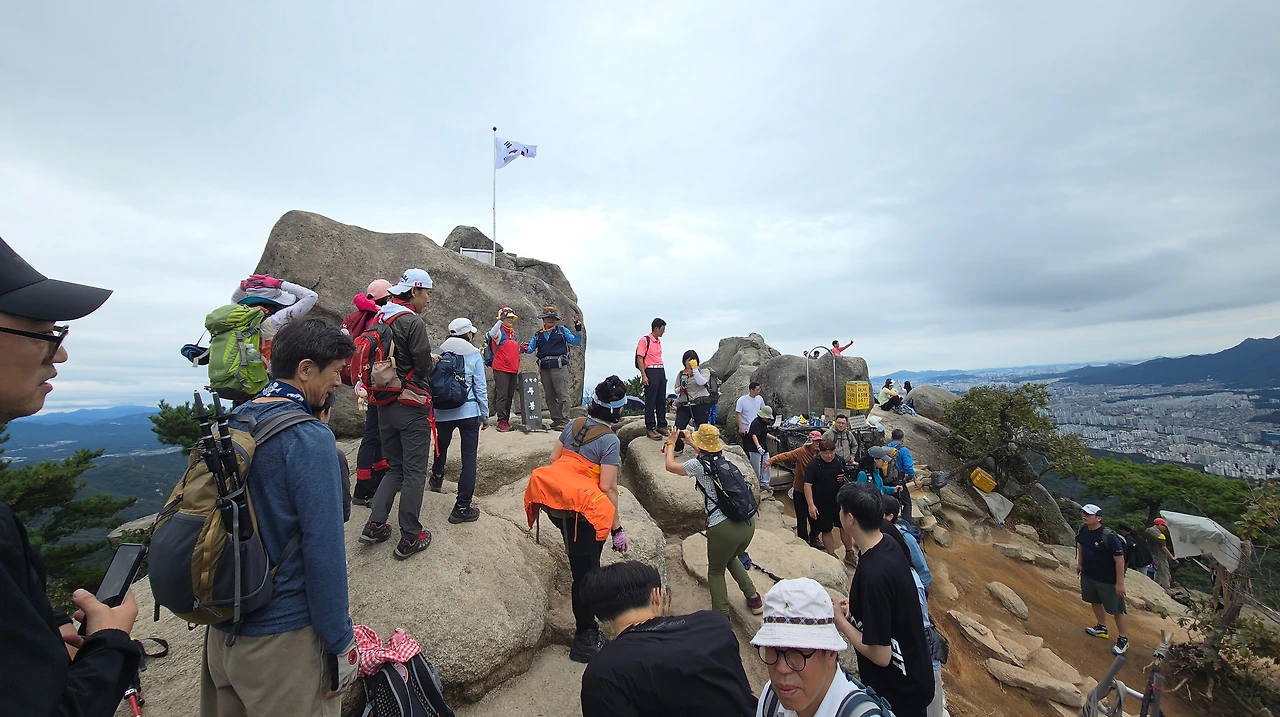 산 정상부에는 많은 산객들이 정상 표지석과 함께 사진을 남기려고 길게 줄지어 차례를 기다리고 있다. 우리도 차례를 기다려 기념사진을 남길 수 있었다. 수락산의 한자를 묻는 내 질문에 '水落山'이라는 정답 대신에 '秀樂山'이라는 잘못된 답을 주는 AI가 웃음을 자아냈다. 힘든 기색이 역력하지만 등로변 곳곳 전망 좋은 곳에 올라서서 탄성을 자아내며 자리를 뜰 줄 모르는 산객들의 모습에서, 어쩌면 ‘빼어날 수(秀), 즐길 락(樂)’이라는 한자가 이 산에 더 잘 어울릴지도 모르겠다는 생각이 들었다.