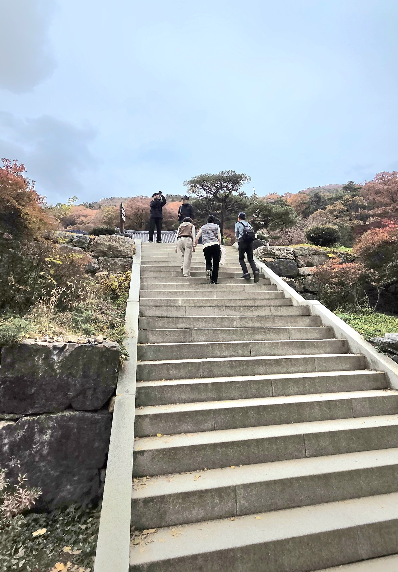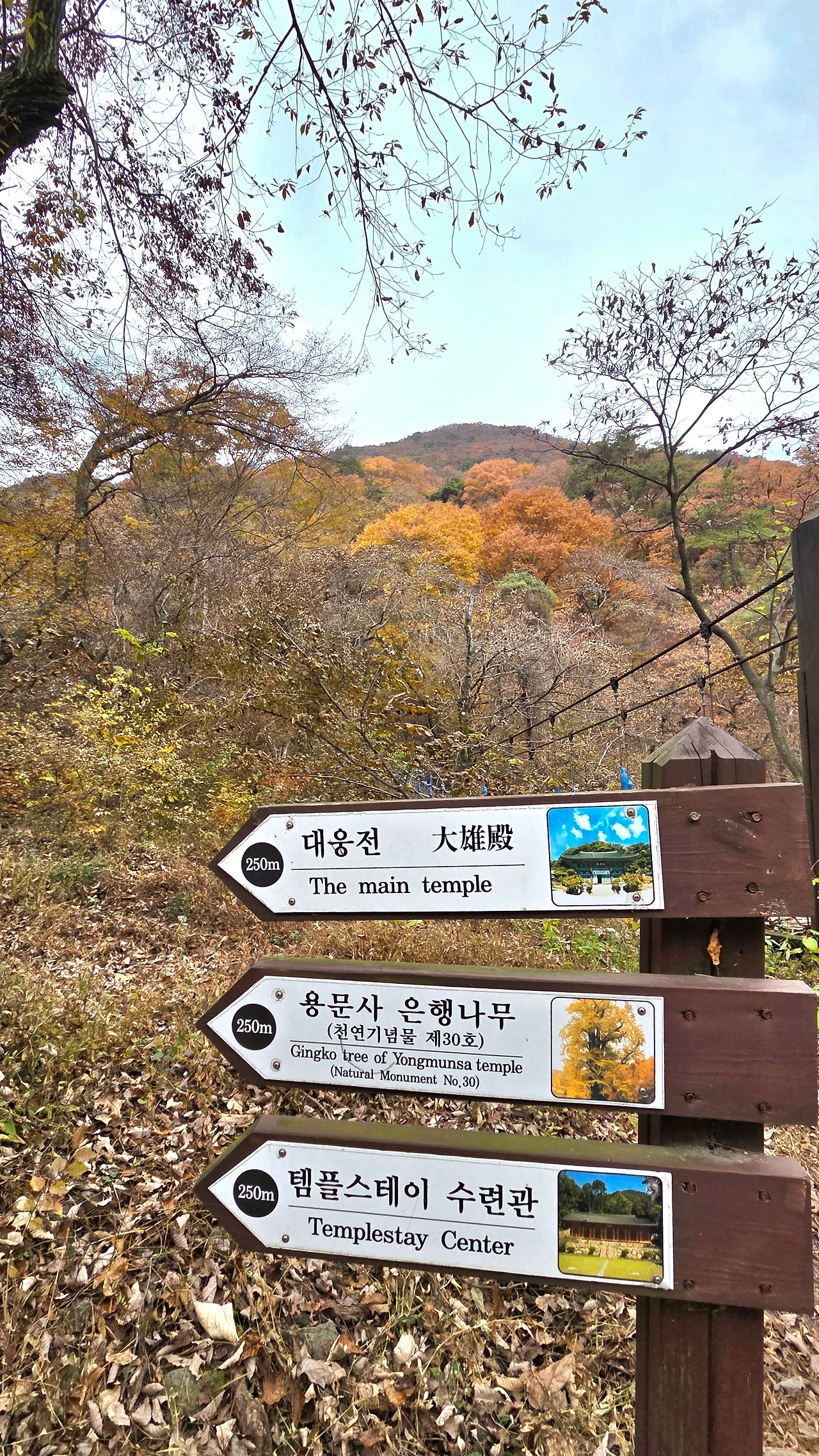용문사를 뒤로 하고, 우리는 일주문 쪽으로 발걸음을 옮겼다. 뒤돌아보니 은행나무는 마의태자와 정암, 죽정, 그리고 이름 모를 사람들이 품었다가 끝내 이루지 못하고 스러진 꿈, 잡히지 않는 신기루처럼 금빛 잎사귀들이 성성한 가지를 높게 펼친 채 여전히 그 자리를 지키고 서 있었다. 가을 햇살은 울긋불긋 물든 산 자락을 부드럽게 감싸고 있고, 길 위에 떨어져 이리저리 바람에 나뒹구는 단풍은 계절을 재촉하는 듯했다.
