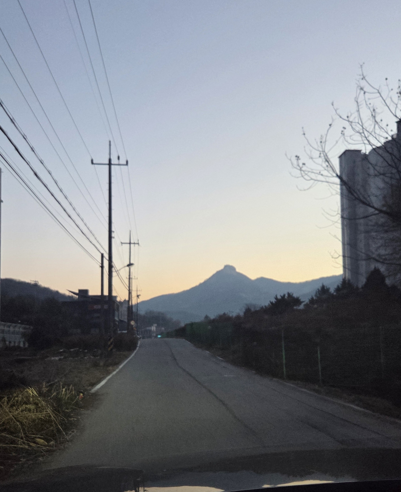 여인네 젖꼭지를 닮은 봉긋한 봉우리가 뒤로 여명의 아우라를 머금은 채 검은 실루엣을 드리우고 있고, 도봉산으로 뻗은 긴 능선은 하늘과 굴곡진 경계를 또렷이 드러내고 있다.