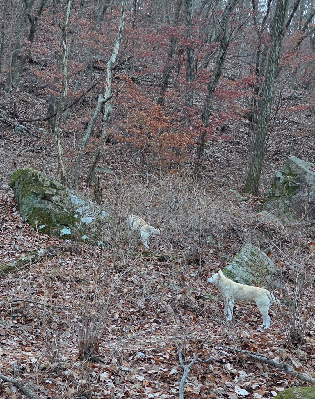 앞쪽 이마 위로 태양을 등진 사패산 정상부 암봉이 눈을 이고 있는 듯 또렷하다. 북한산둘레길 산너미길 코스로 접어들어 계곡을 따라 올랐다. 둘레길을 따라 좌측으로 휘돌아 오를 요량이다. 어디서 나타났는지 백구 한 쌍이 먹을 것을 찾는 듯 산기슭에 수북이 싸인 낙엽을 파헤친다. 인간의 손길을 벗어나 산속 자유로운 삶을 택했지만, 저들에게 길고 추운 겨울은 녹록지 않을 것이다.