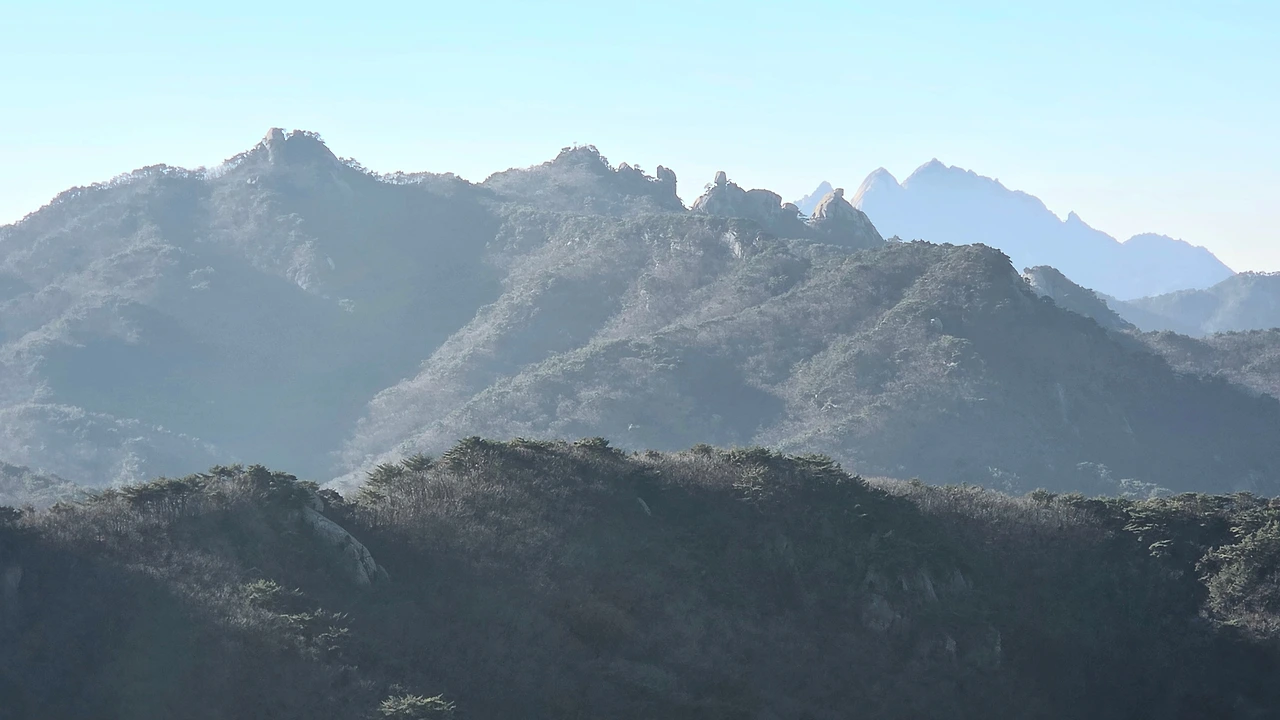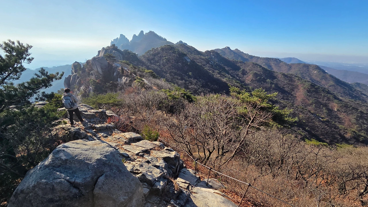 포대능선 쪽 가파른 계단길로 접어들자 숨이 턱밑까지 차올랐다. 멀리서 포격 소리가 이따금씩 들려왔다. 계단길 저 위 능선마루에 걸린 태양이 용이 희롱하던 여의주 마냥 눈부신 빛을 발하며 어서 올라오라고 손짓한다. 그 위 포대능선의 초입으로 올라섰다. 이곳도 산객들이 쉬어가는 장소라서 그런지 또 다른 탁발승인양 고양이 한 마리가 자리를 잡고 있다. 능선마루는 앞쪽으로 여러 봉우리들과 함께 저 멀리 자운봉과 신성봉을 파노라마처럼 펼쳐 놓았다.
