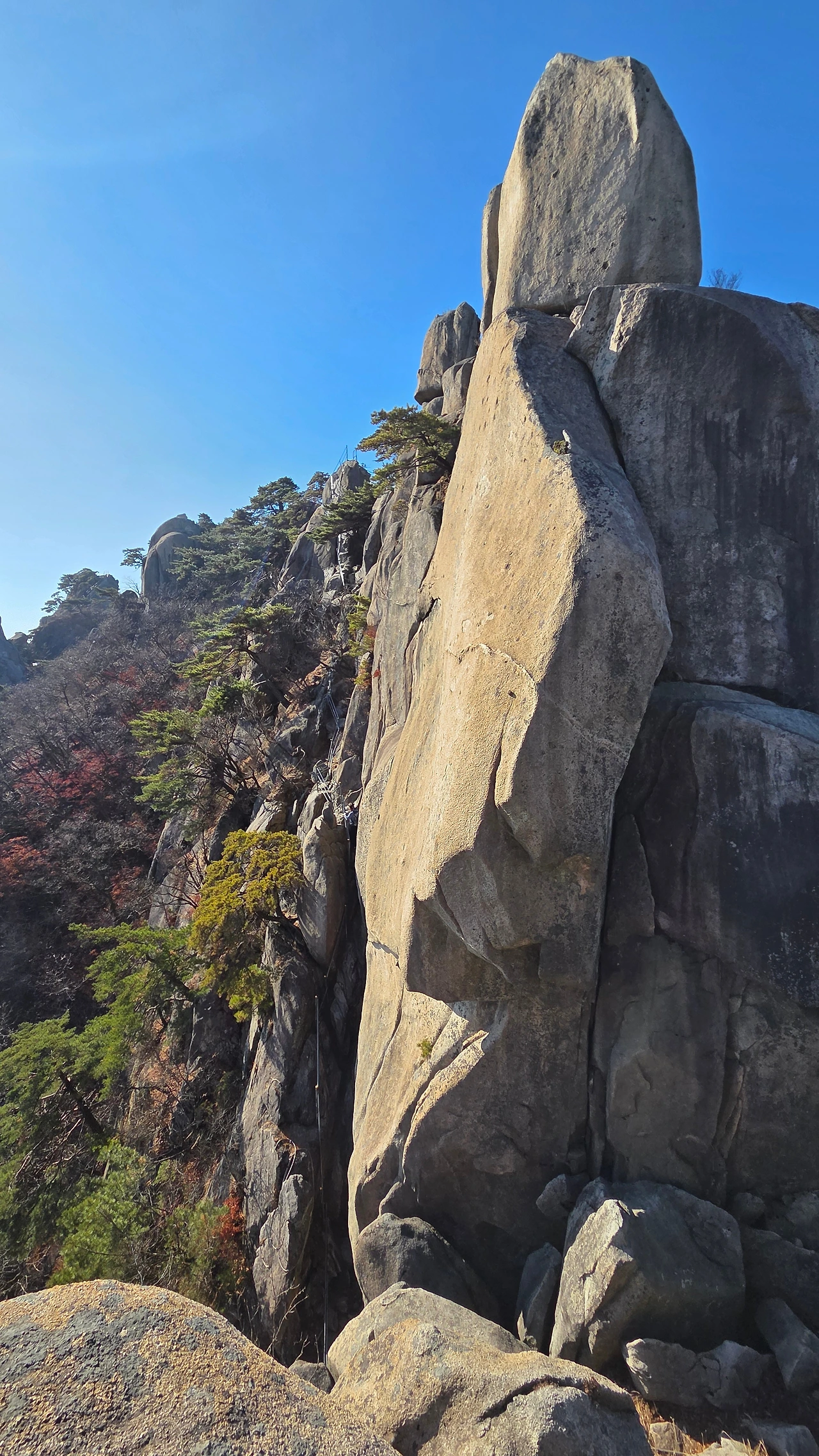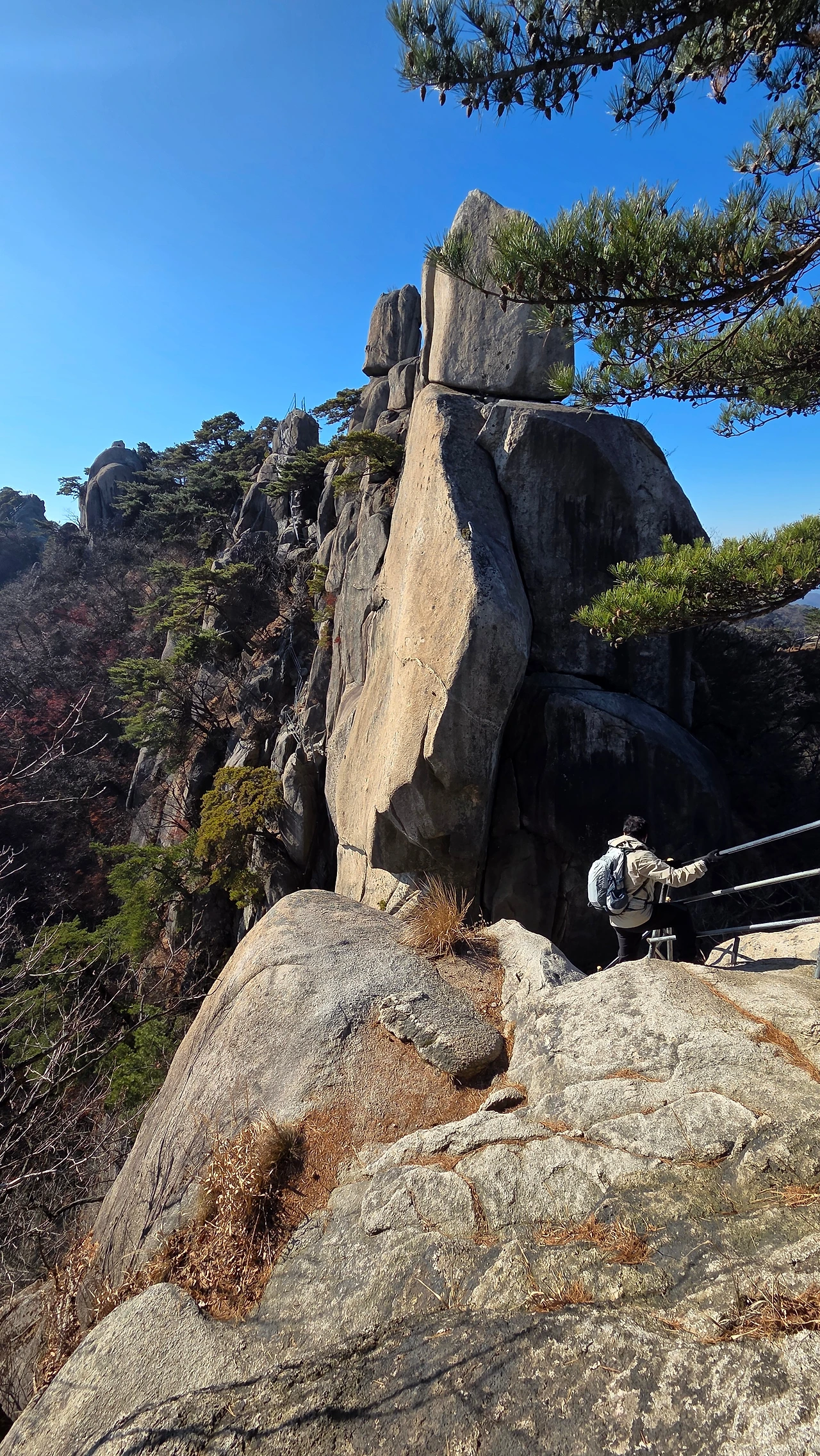 난간과 바위에 박힌 철심에 몸을 의지하며 두 암봉 사이 좁고 깊게 파인 와이계곡을 통과했다. 스트레칭하듯 다리와 팔을 뻗치고 철봉과 바위틈을 붙잡으며 수직 암곡을 힘겹게 내려갔다 오르는 스릴은 예전이나 지금이나 다를 바 없이 그만이다. 와이계곡 건너편 암봉 위로 올라서니, 저 앞쪽 포대능선이 다하는 곳에 자운봉과 신선대 암봉이 나란히 위용을 뽐내며 솟아 있다.