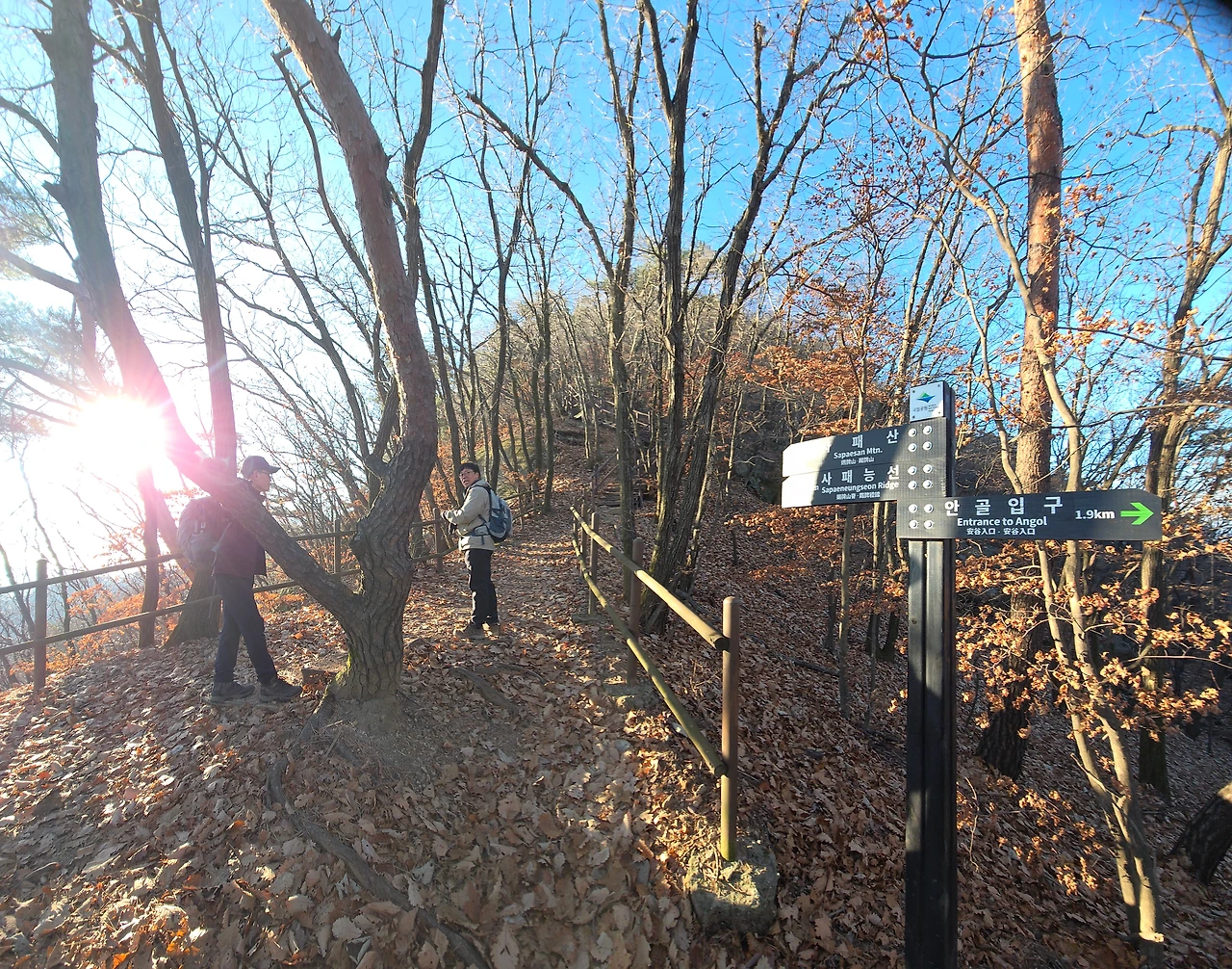 앞쪽 이마 위로 태양을 등진 사패산 정상부 암봉이 머리에 눈을 이고 있는 듯 또렷하다. 북한산둘레길 산너미길 코스로 접어들어 계곡을 따라 올랐다. 둘레길을 따라 좌측으로 휘돌아 오를 요량이다. 어디서 나타났는지 백구 한 쌍이 어울려 먹을 것을 찾는 듯 산기슭에 수북이 싸인 낙엽을 파헤친다.